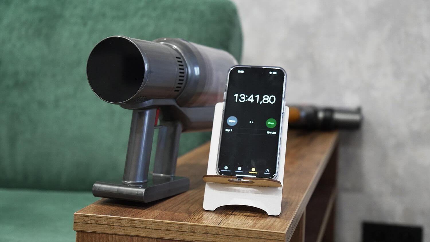 Galiausiai pereikime prie bandymų. Pirmiausia patikrinkime „Liectroux i10“ baterijos veikimo laiką turbo režimu su prijungtu pagrindiniu grindų antgaliu. Jis veikė 13 minučių ir 41 sekundę, o tai paprastai yra geras rezultatas. Standartinis belaidžių dulkių siurblių veikimo laikas yra nuo 10 iki 12 minučių.