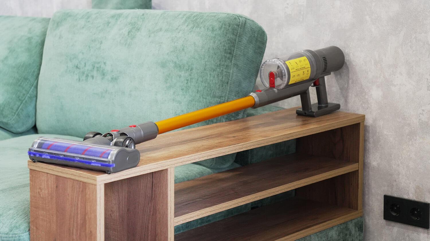 Baterija yra išimama, o tai yra privalumas. Dulkių siurblys įkraunamas per angą po rankena.