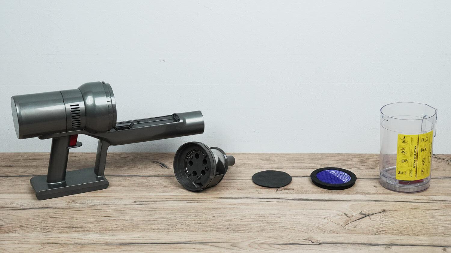 Dulkių surinktuvas yra visiškai nuimamas, o tai taip pat gerai. Apatinis fiksatorius yra nepatogioje vietoje ir pasiekiamas tik išėmus kolbą. Filtravimo sistemą sudaro audinio filtras, putplasčio filtras, cikloninis filtras ir tinklelio filtras.
