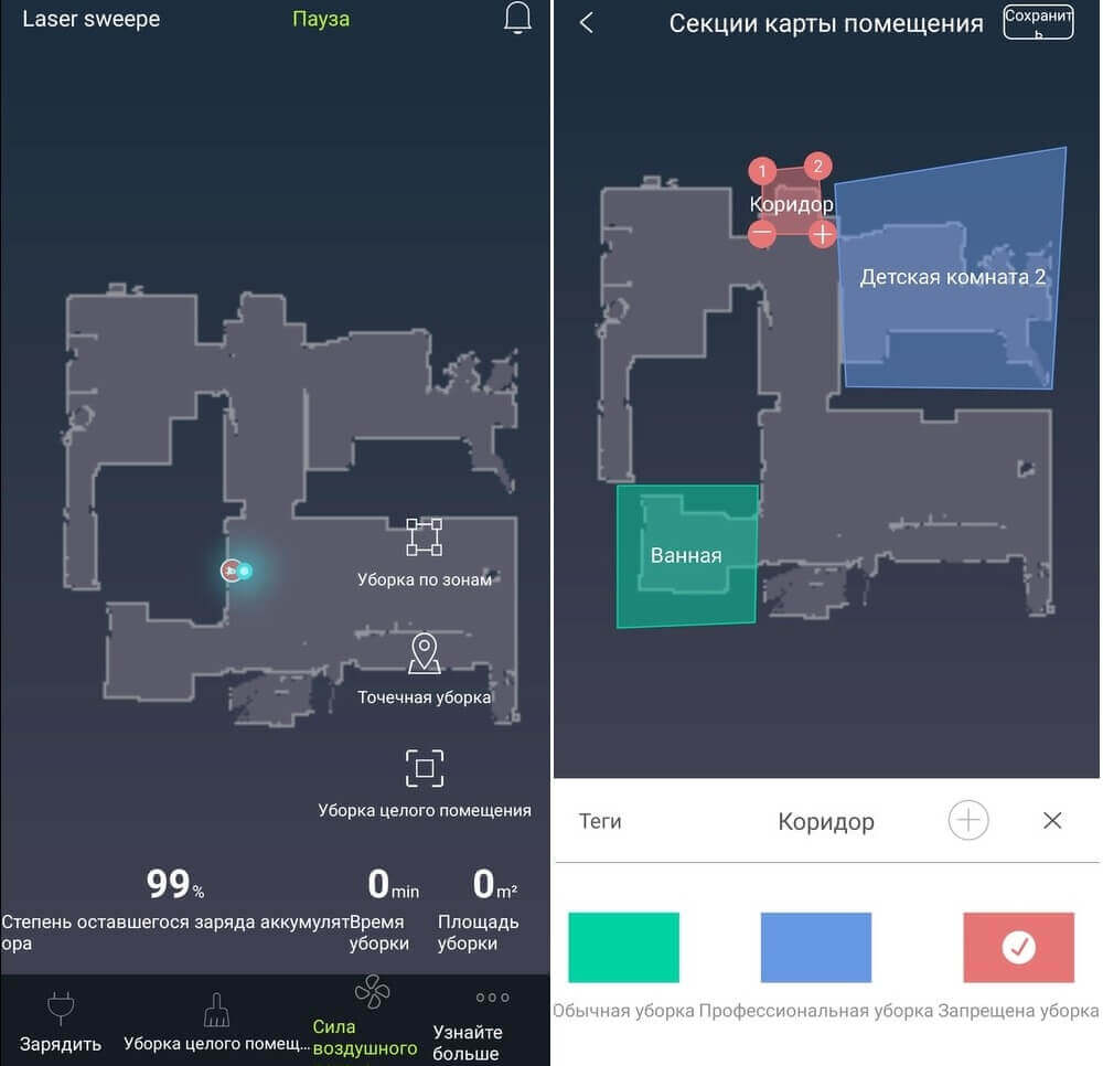 Žemėlapis sukurtas. Pažvelkime į naujas funkcijas. Apatinėje eilutėje matome mygtukus, skirtus priverstiniam grįžimui į bazę, automatiniam valymo režimui ir siurbimo galios reguliavimui (3 lygiai). Žemėlapyje taip pat galite nustatyti valymo zonas. Pavyzdžiui, galite sukurti atskiras zonas kiekvienam kambariui arba kambario daliai. Taip pat galite nustatyti draudžiamus zonas, į kurias robotas neįeis valymo metu.