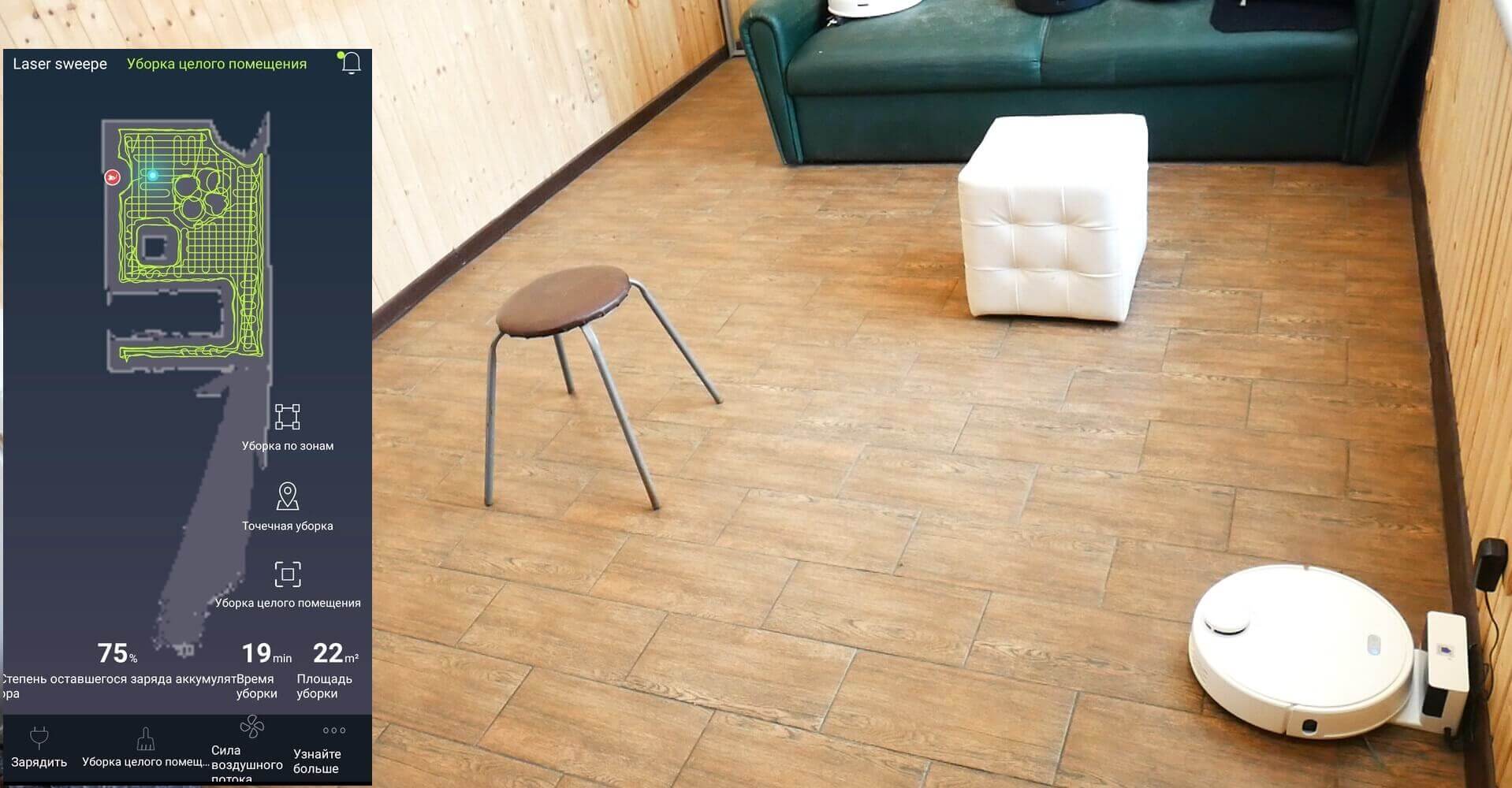 Matote, kad robotas be jokių problemų išvalė visą galimą plotą. Jis išvalė aplink kiekvieną kėdės koją, aplink pufą ir tamsioje vietoje už sofos. Veidrodinės spintos durys įnešė klaidą į žemėlapio sudarymą, tačiau tai neturėjo įtakos valymo rezultatams. Robotas netrenkė į veidrodį; jis atsargiai valė šalia jo ir tęsė valymo ciklą. Taip pat svarbu atkreipti dėmesį, kad robotas išvalo galimą plotą dviem praėjimais, antrąjį statmenai pirmajam. Tai pagerina valymo kokybę, bet taip pat turi įtakos valymo greičiui. Mūsų atveju robotas išvalė 11 kvadratinių metrų per 19 minučių.