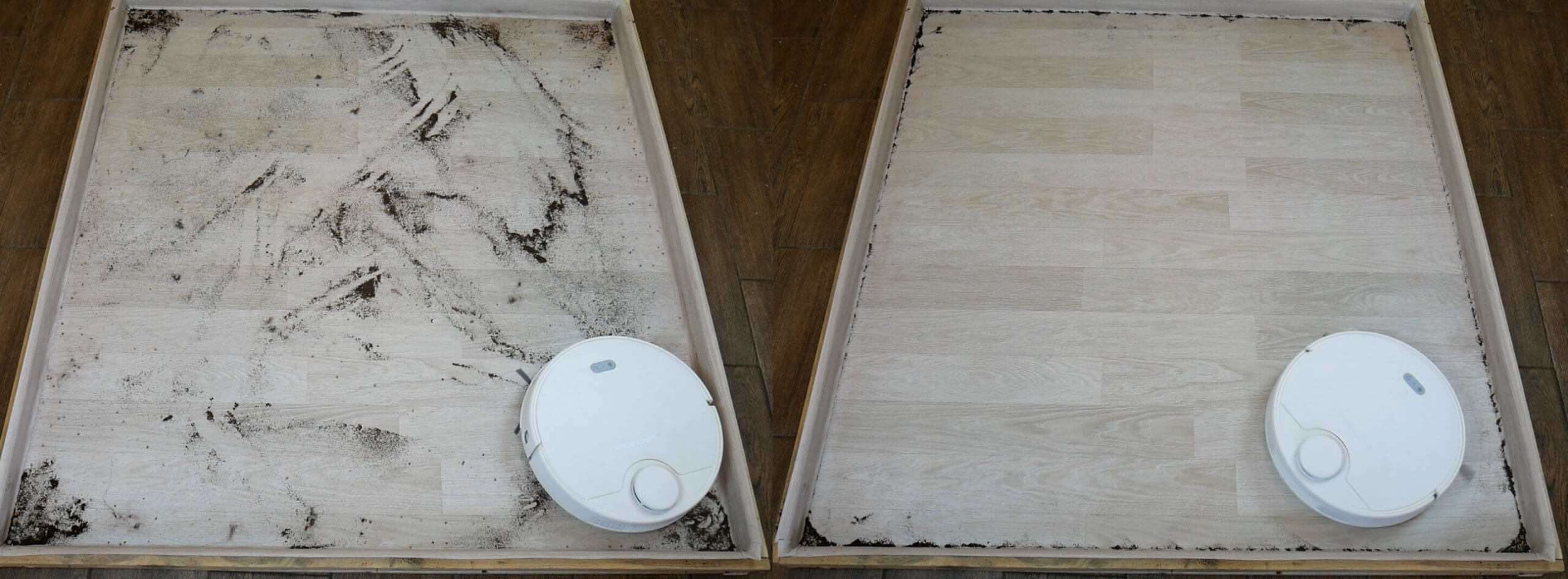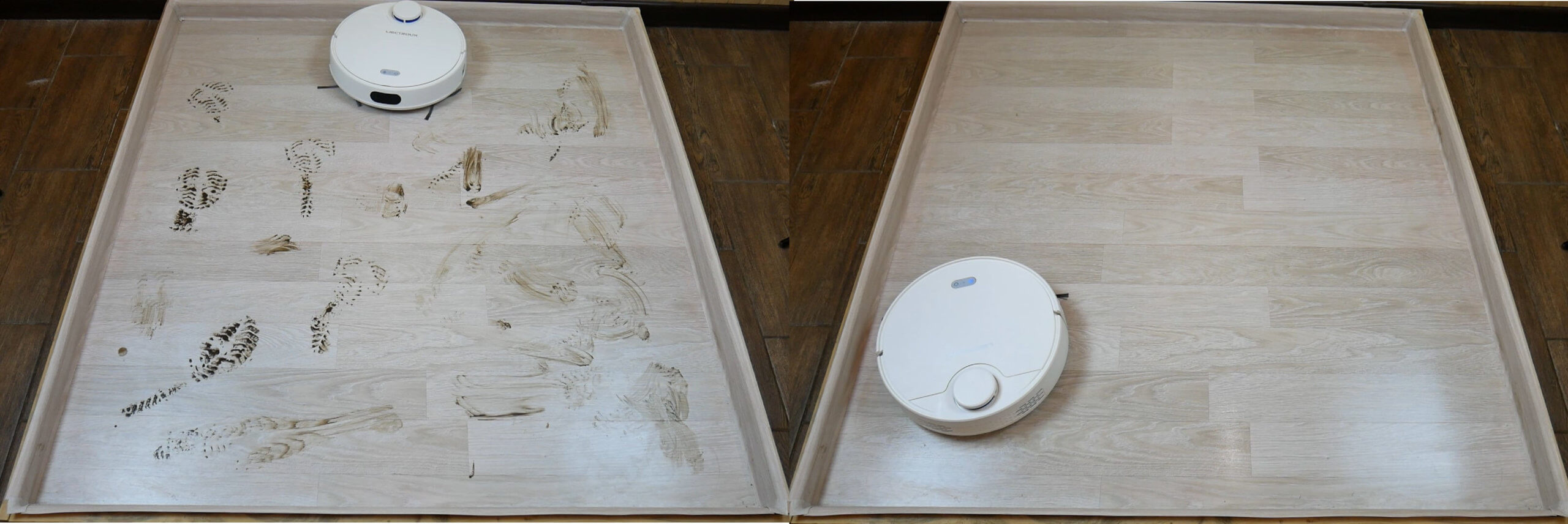 Pažiūrėkite, kaip „Liectroux ZK901“ valo grindis. Laminatą ištepėme batų purvu. Vandens srautas į šluostę buvo nustatytas ties 3 lygiu.