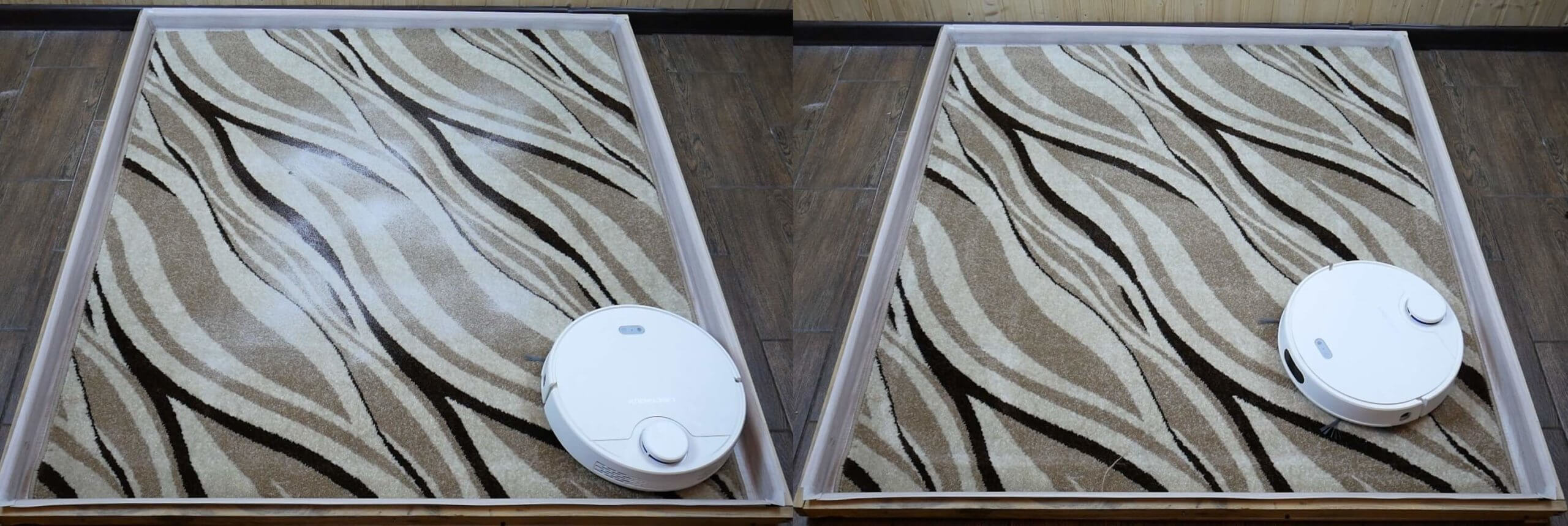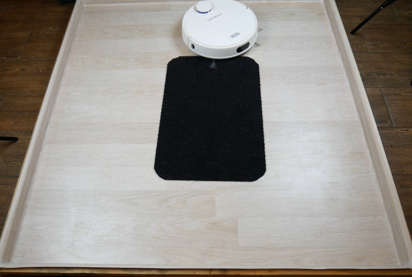 Galiausiai išbandėme, ar „Liectroux ZK901“ buvo jautrus tamsioms grindų sritims. Mūsų atveju tai buvo juodas kilimas.