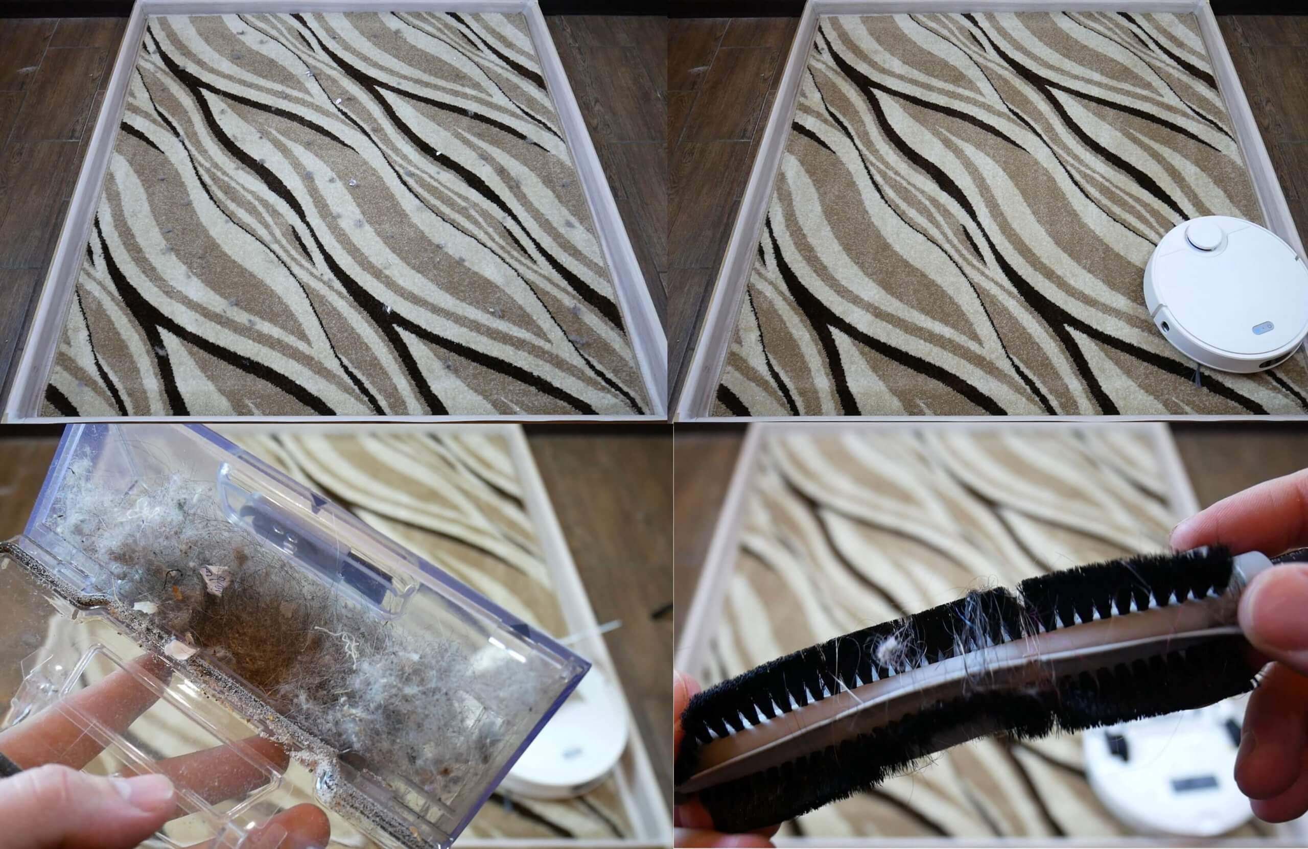 Vėliau ant kilimo išbarstėme kailį, plaukus ir popieriaus skiautes. Matote, kad robotas surinko beveik visas šiukšles nuo kilimo, likdamas tik mažas kailio gumulėlis. Didžioji dalis šiukšlių buvo surinkta dulkių konteineryje, o plaukai ir kailis buvo susivėlę aplink turbo šepetį.