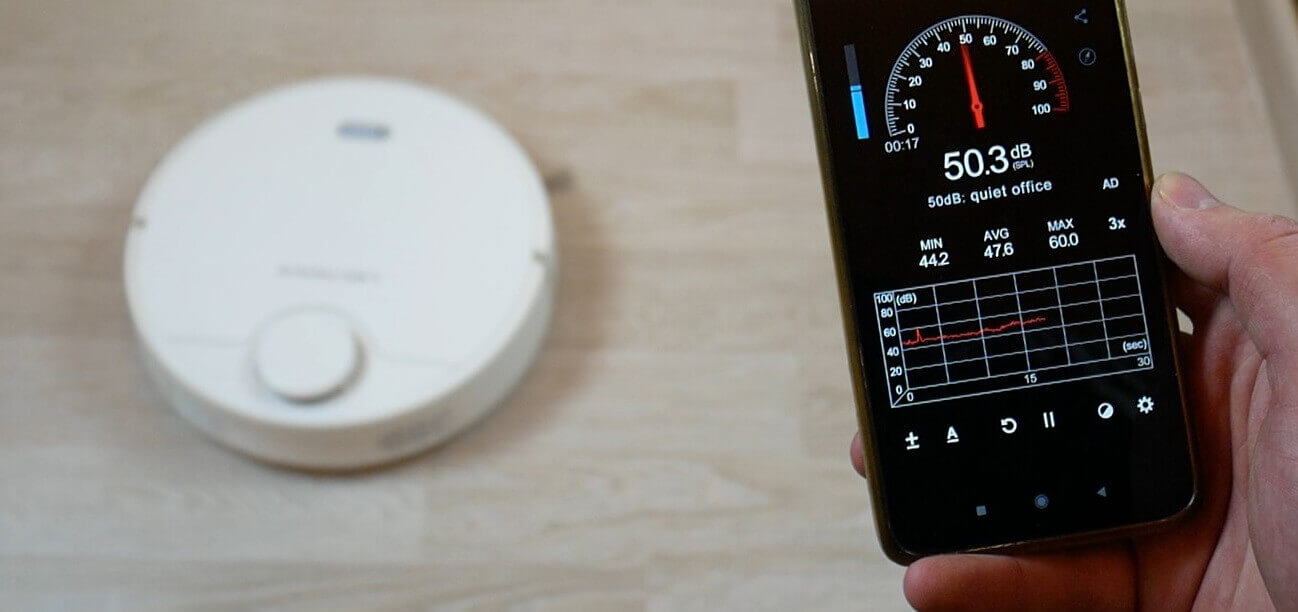 Esant minimaliai galiai, triukšmo lygis siekia 48,2 dB, esant vidutinei galiai – kiek mažiau nei 52 dB, o maksimaliai – neviršija 56 dB. Atsižvelgiant į didelę siurbimo galią, robotas yra tylus.