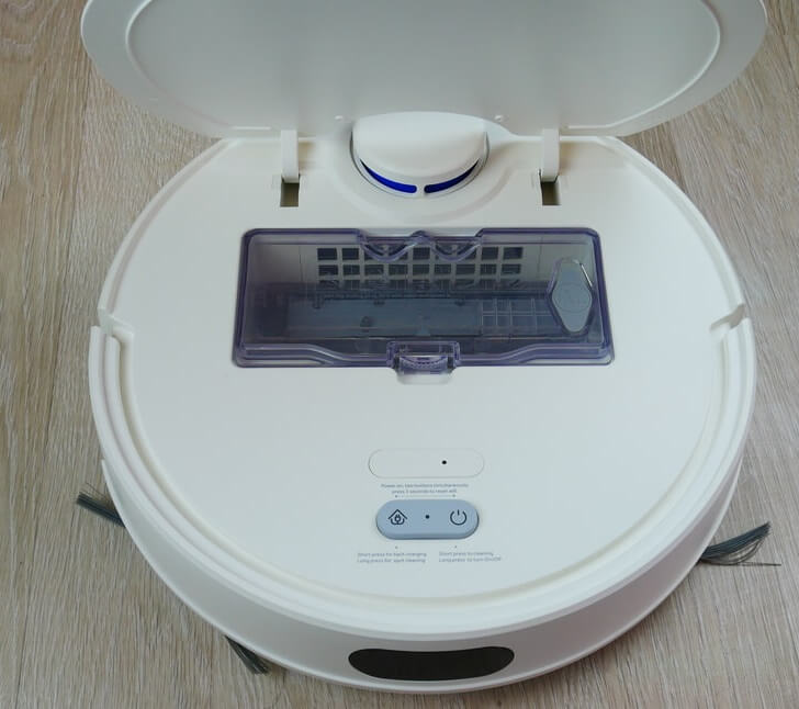 Pažvelkime į patį robotą atidžiau. Jis baltas, primenantis populiarųjį pirmosios kartos „Xiaomi“ robotinį dulkių siurblį. Viršuje sumontuotas navigacijos jutiklis ir du mechaniniai valdymo mygtukai: „Start“ / „Pause“ ir priverstinis grįžimas į įkrovimo bazę.