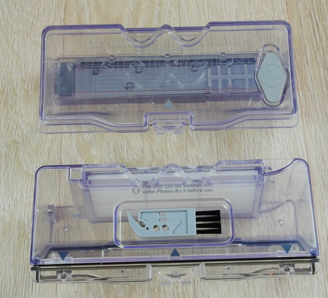 Dulkių talpyklos dangtelis atsidaro, kad būtų lengva jį išimti. Gale yra tinklelis ir klostuotas filtras orui valyti. Dulkių talpyklos talpa yra 450 ml, kurios pakanka keliems valymo ciklams.