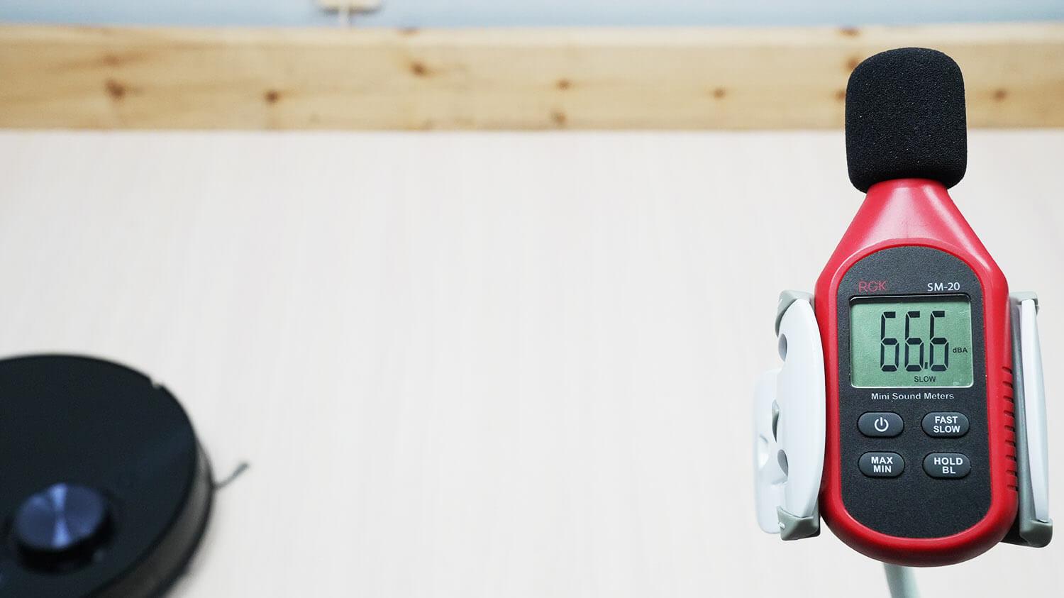 Galiausiai išmatuojame roboto triukšmo lygį. Jis svyruoja nuo 60 iki 67 dB, priklausomai nuo pasirinkto galios lygio. Tai standartinis triukšmo lygis, ir tai tiesa net ir esant didelei galiai!