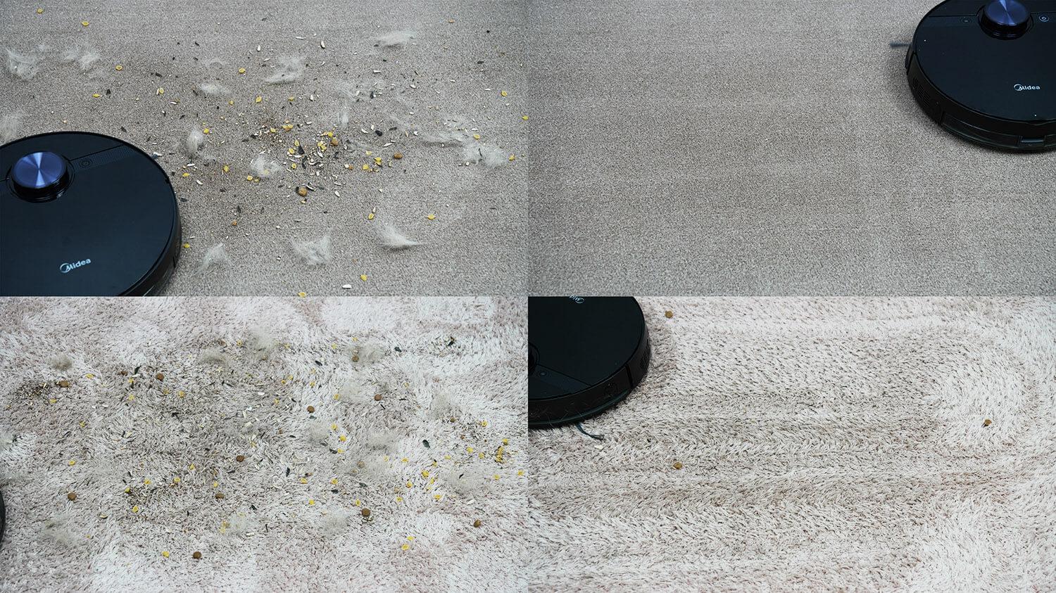 Robotas be jokių problemų valo trumpo plauko kilimus. Vidutinio plauko kilimų valymo kokybė yra šiek tiek prastesnė, tačiau didžioji dalis šiukšlių vis tiek surenkama. Krūvoje gali įstrigti kelios šiukšlių dalelės, bet nemanau, kad tai didelė problema, atsižvelgiant į pradinę kilimo būklę.