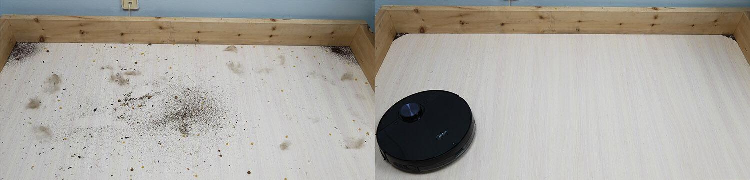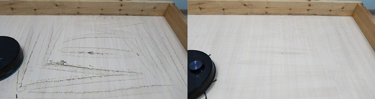 Laminuotų grindų valymo efektyvumas prilygsta panašiems gaminiams – pašalino beveik visas šiukšles, išskyrus nedidelius likučius kampuose, kuriuos sunku pasiekti apvaliems robotams. Centrinis šepetys nesurinko jokių naminių gyvūnėlių plaukų, todėl testą išlaikė.