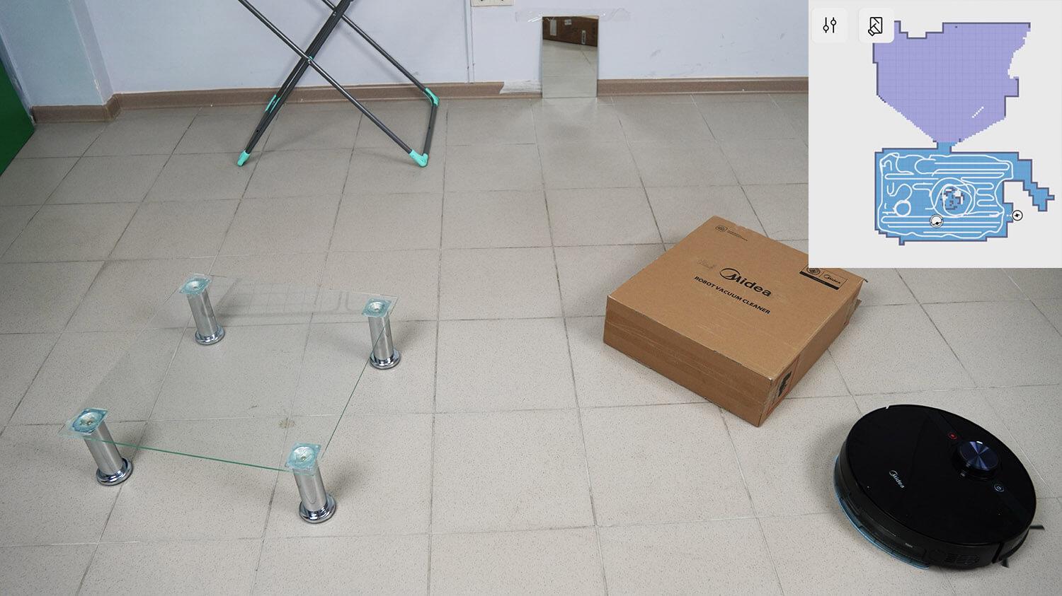 Galiausiai pereikime prie bandymų. Pirmiausia išbandysime navigaciją kambaryje su kliūtimis. Pirmiausia robotas apeina pasirinktos zonos perimetrą. Jis sukūrė neegzistuojantį kambarį už veidrodžio – tai tipiška „lidar“ robotų problema. Jis neužstrigo ant drabužių džiovyklės. Apėjęs perimetrą, „Midea VCR M7 EVO“ pradėjo valyti visą prieinamą zoną gyvatės būdu. Jis taip pat apėjo dėžę ir chromuotas kėdės kojas, jas gerokai perkeldamas. Tada grįžo į savo pagrindą.