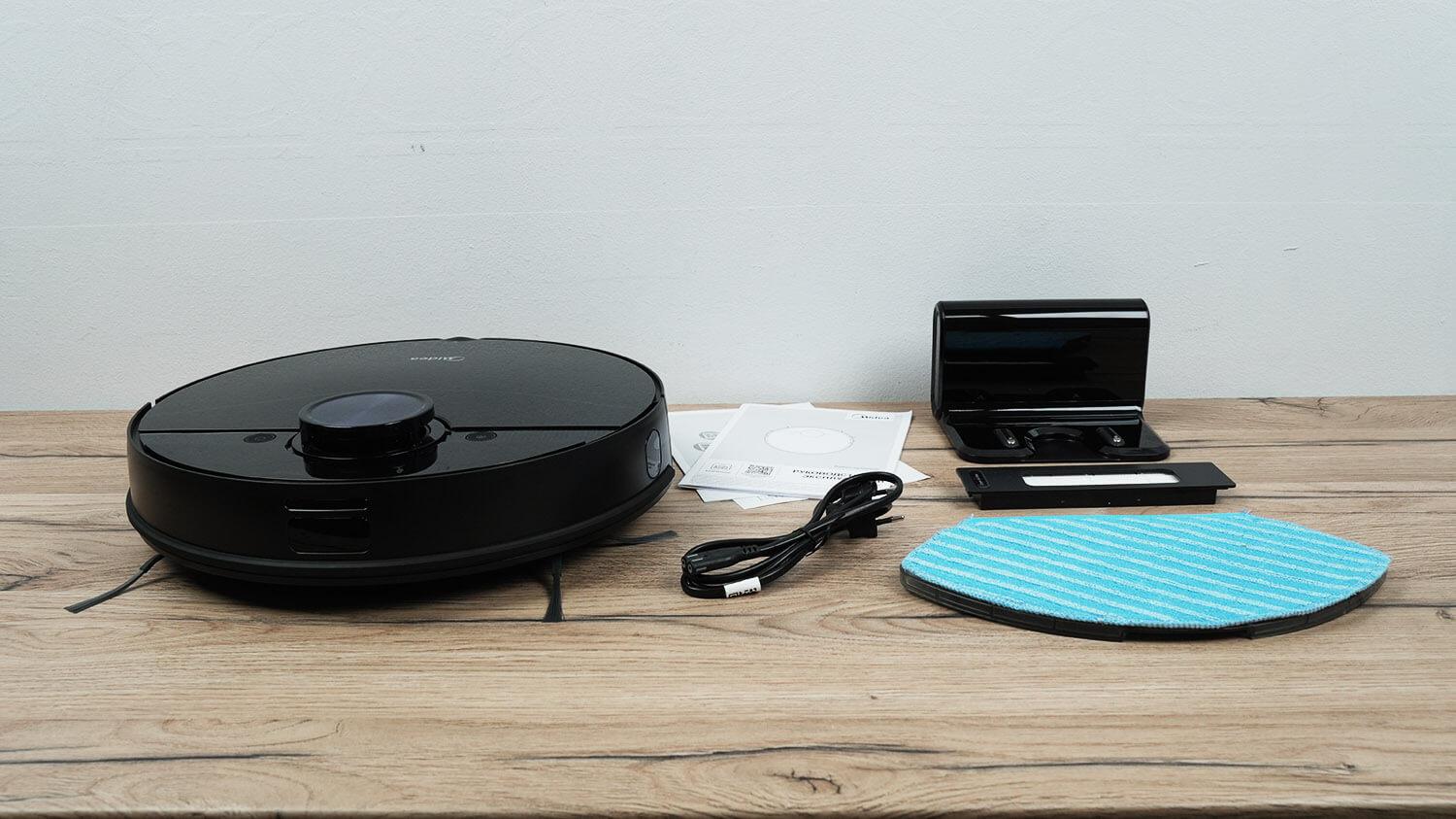 Be paties roboto, pakuotėje yra įkrovimo bazė su maitinimo adapteriu, laikiklis su valymo šluoste, atsarginis HEPA filtras ir naudojimo instrukcija.