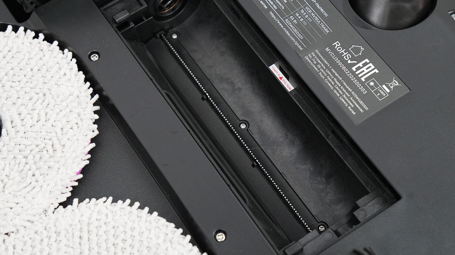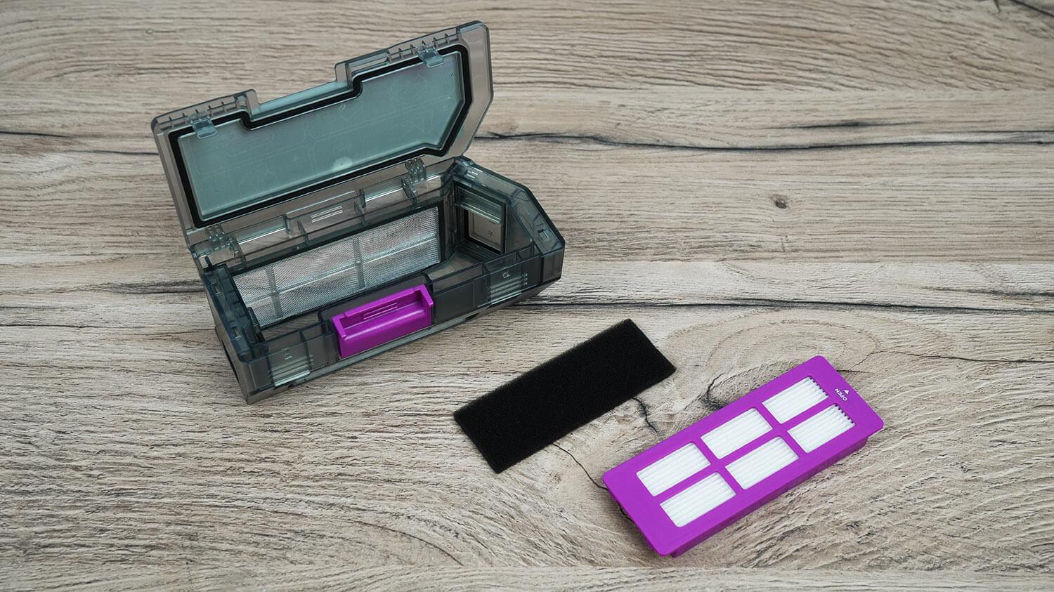 Talpykloje yra HEPA filtras, putplastis ir tinklelis. Vandens bakas yra paslėptas pačiame robote ir talpina tik 45 ml.