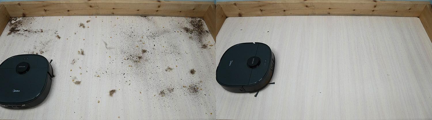 Kalbant apie siurbimo galią, tyliuoju režimu „Midea VCR V15 Pro Ultra“ galėjo visiškai išvalyti tik 2 mm gylio plyšį. Standartiniu režimu rezultatas nepakito, kaip ir turbo režimu. Tačiau „labai stipriu“ režimu jam pavyko iš dalies išvalyti šiukšles iš 4 mm gylio plyšio. Taigi, faktinė siurbimo galia yra artimesnė standartinei vertei. Tai greičiausiai lemia aerodinaminiai nuostoliai, kurie pastebimi ir daugumoje kitų prekių ženklų robotų, nepaisant to, kad jie taip pat nurodo 15 000 ir 20 000 paskalių.