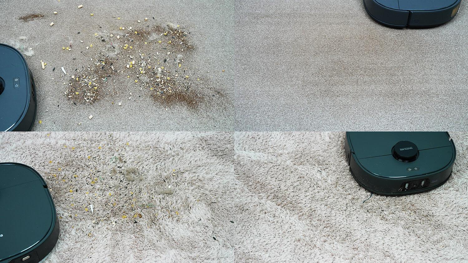 Laminuotų grindų šiukšlių surinkimo kokybė buvo gera. Nuo lentynos buvo surinktos įvairios šiukšlės, įskaitant kačių kraiko granules, kurios dažnai užkemša turbo šepetį. Svarbu tai, kad šis robotas dulkių siurblys gerai išvalė kampus, nepalikdamas jokių šiukšlių. Taip yra dėl jo kvadratinio korpuso.