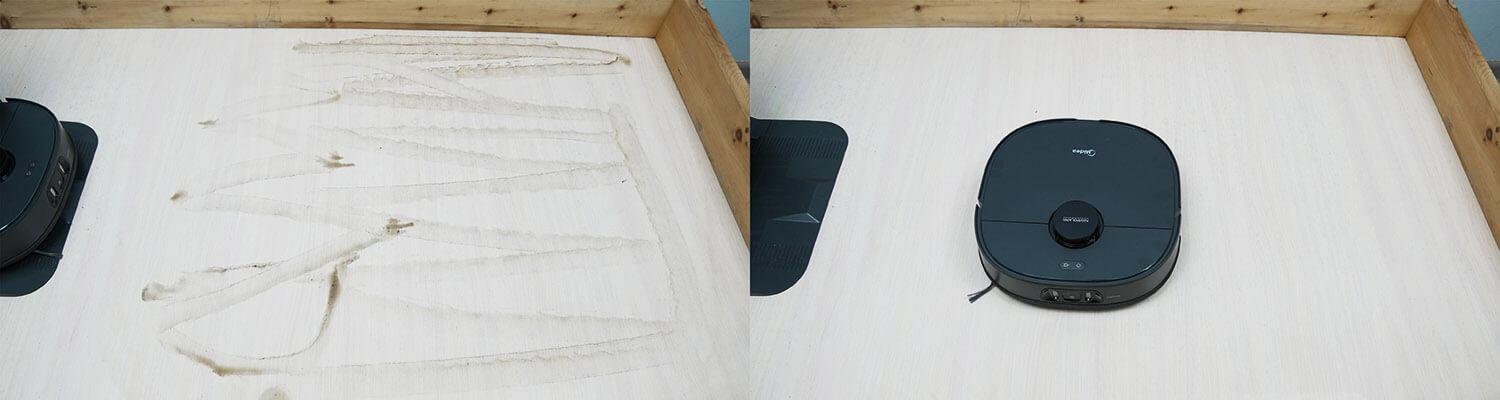 Mane nustebino dėmių valymui naudojamas algoritmas. Robotas dulkių siurblys juda atgal, pašalindamas dėmes. Manau, tai daroma siekiant išvengti, kad robotas į dėmes atsitrenktų priekiniu voleliu ir ratukais. Jis juda šluostėmis į priekį, taip sumažindamas užterštumą. Nieko panašaus iš kitų prekių ženklų nemačiau, ir tai įdomus požiūris. Taigi, prieš tęsiant įprastą sausą ir šlapią valymą, jam teko du kartus peržiūrėti kiekvieną vietą. Dėmės nebuvo visiškai pašalintos, tačiau liko minimalių pėdsakų, kurių objektų atpažinimo sistema turėjo nepastebėti dėl plytelių rašto. Bet kokiu atveju, testą išlaikiau!