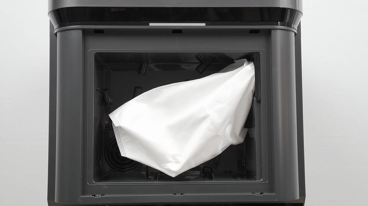 Standartinis 3 litrų atliekų maišas yra centre po dangteliu.