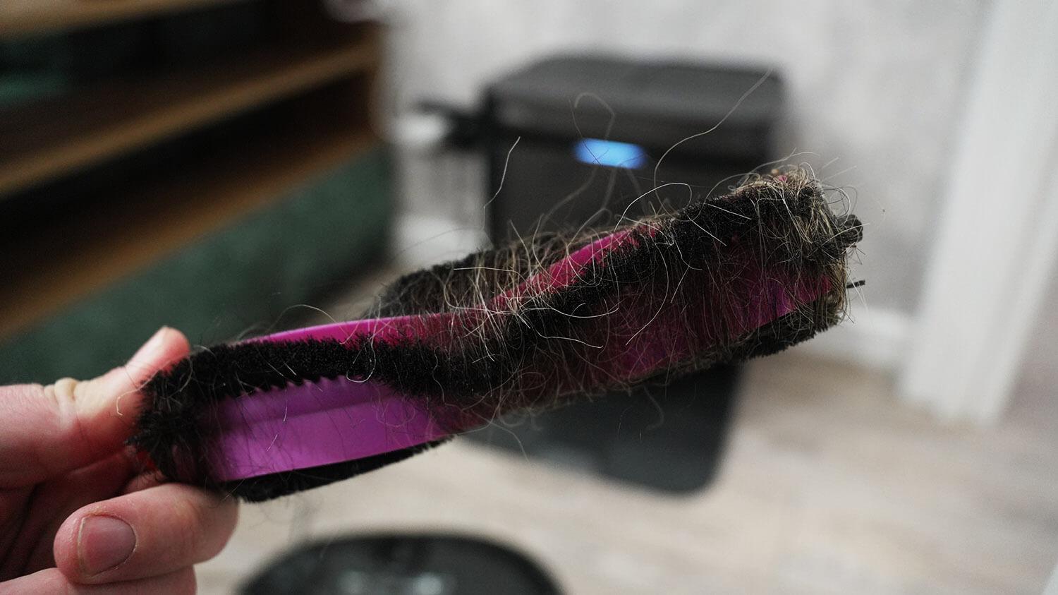 Jis apsivyniojo aplink turbo šepetį Įkliuvo šiek tiek plaukų ir kailio, ir peiliai tiesiog nespėjo jų nukirpti. Toliau atskirai išbandysiu apsaugos nuo plaukų susivėlimo sistemą.