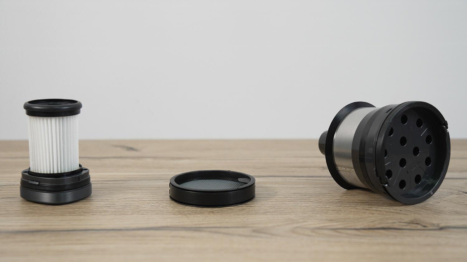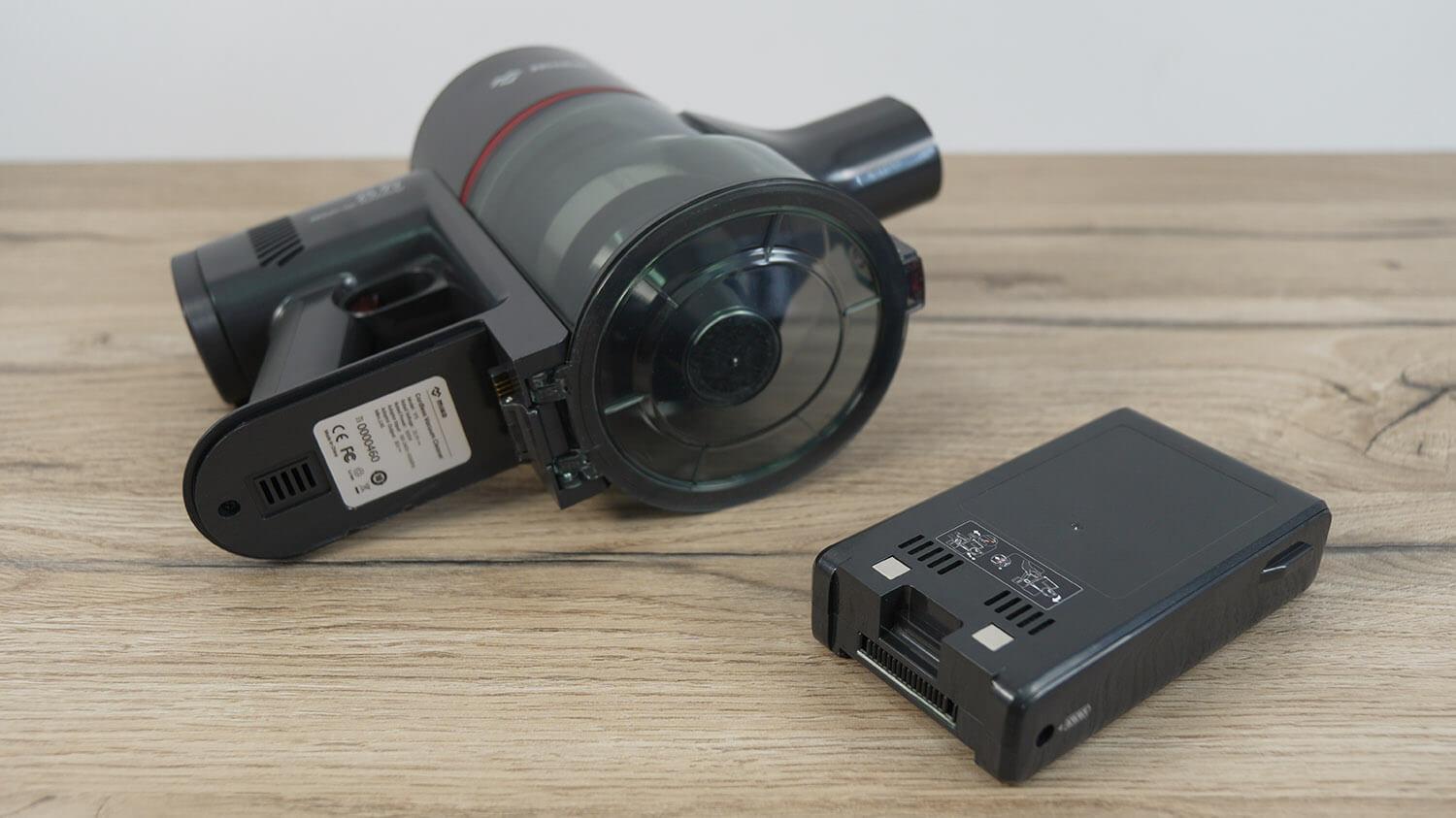 Nuimamas dulkių surinktuvas yra privalumas. Filtravimo sistemoje naudojamas sudėtinis filtras, ciklonas ir tinklelis. Konteineris atidaromas paspaudus atleidimo mygtuką. Šiukšlės iškrenta per atidaromą dangtelį, kuris tarnauja kaip kolbos dugnas. Svarbu atkreipti dėmesį, kad pagrindinio įrenginio gale yra kitas filtras – HEPA filtras.