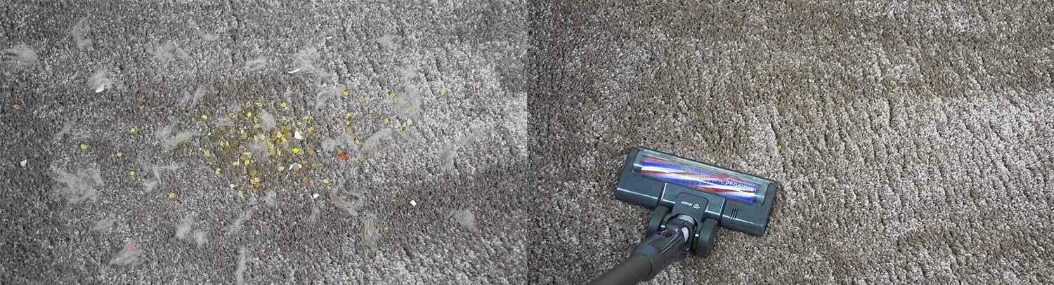 Tos pačios šiukšlės buvo išbarstytos ant žemo plauko kilimo, ir „Miko V15“ atliko tokį pat gerą darbą, kruopščiai išvalydamas kilimą.