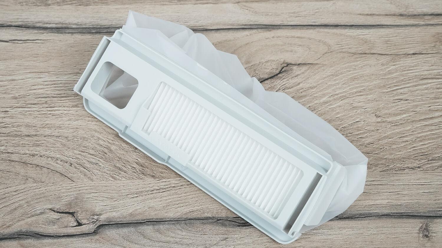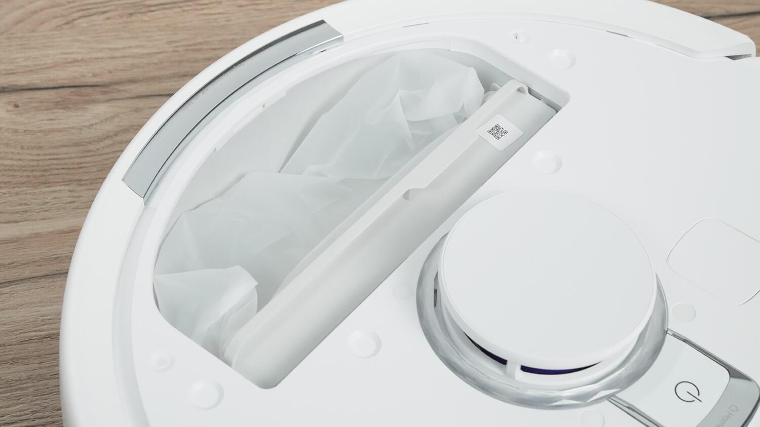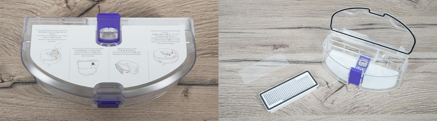 Vietoj vienkartinio maišelio galite įmontuoti viso dydžio dulkių surinktuvą, kaip ir panašiuose gaminiuose. Filtravimo sistemoje naudojamas HEPA filtras ir tinklelis. Turinys išpilamas iš konteinerio per dugną, kuris užfiksuojamas mechaniniu mygtuku. Svarbu atkreipti dėmesį, kad robotas neturi vandens bako. Servetėlės sudrėkinamos tik stotelėje.