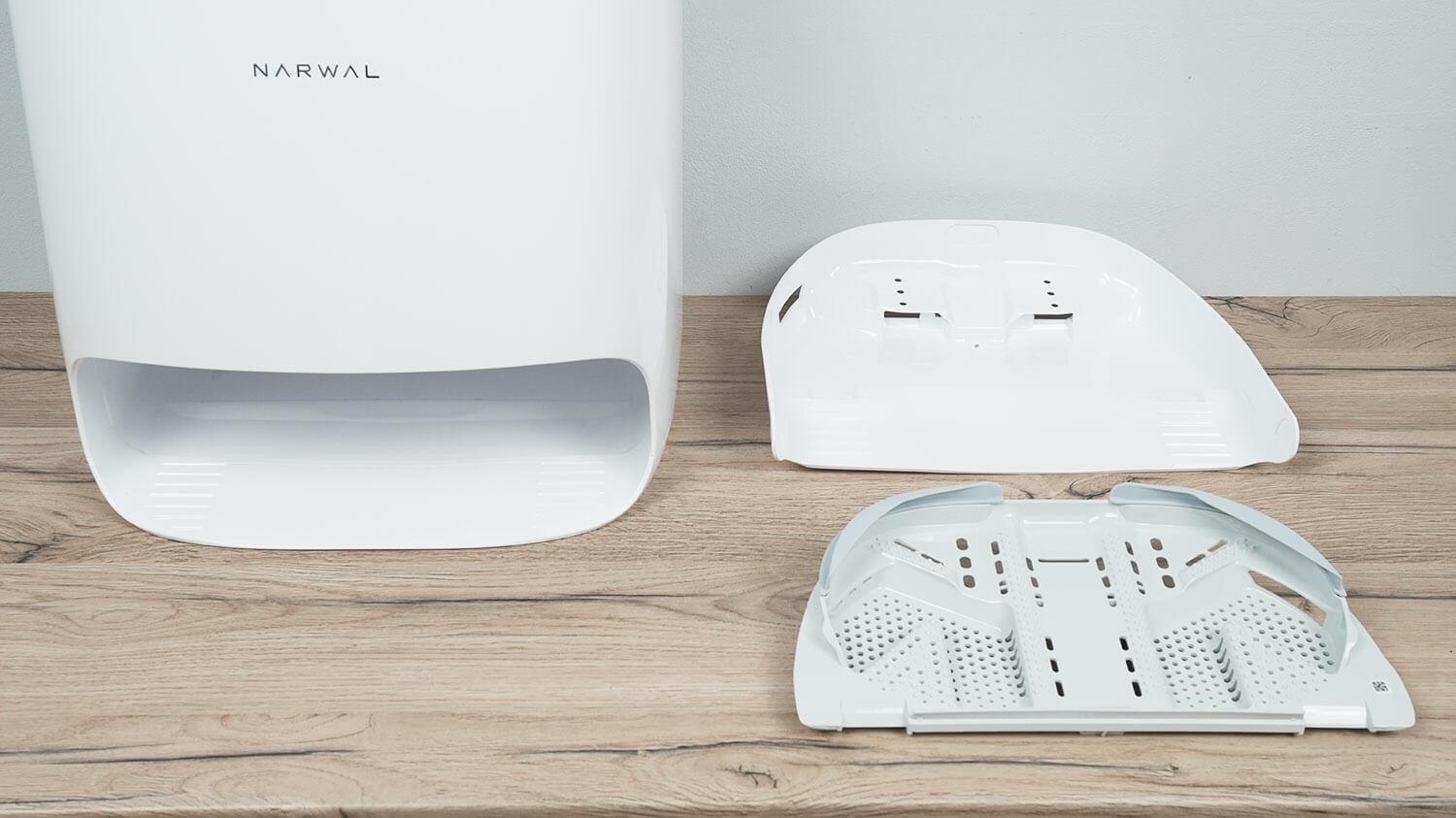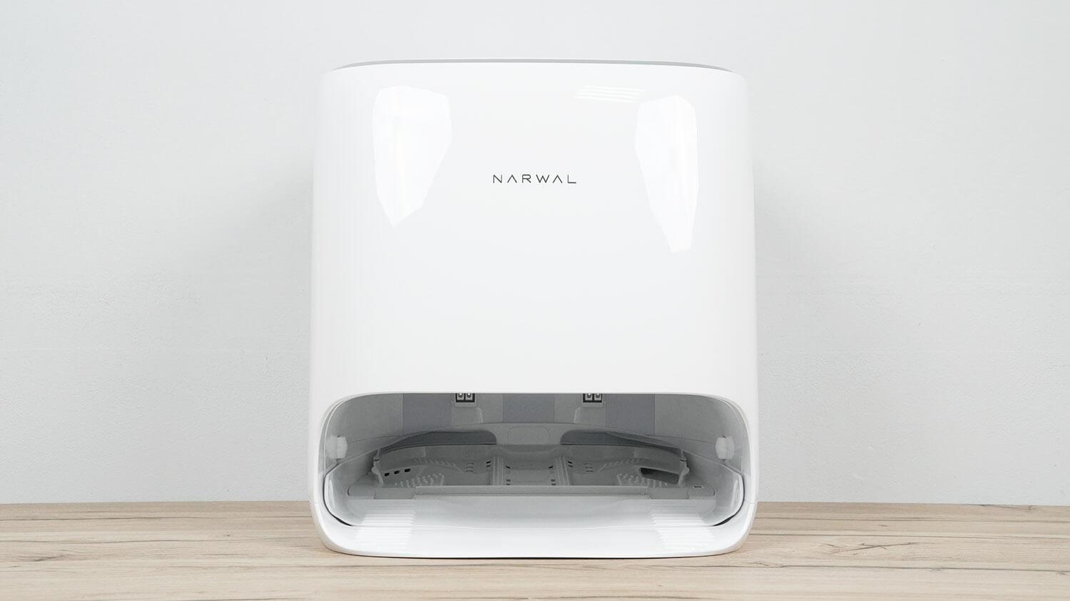 Pereikime prie stotelės. Čia „Narwal Freo X Ultra“ skalbia audinius ir juos džiovina ore. Skalbimo metu vanduo neįkaista, tačiau džiovinimo metu oro temperatūra pasiekia 40 laipsnių Celsijaus. Be to, jis džiovina ne tik audinius, bet ir dulkių surinktuvo turinį.