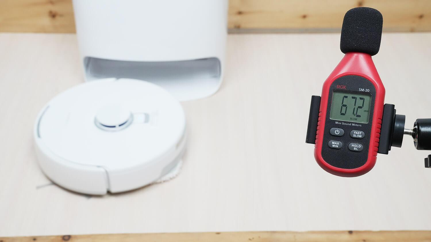 Kalbant apie triukšmo lygį, jis svyruoja nuo 59 iki 68 dB, o tai yra standartinis rodiklis. Kadangi robotas neturi triukšmingos savaiminio išsivalymo dulkių surinktuvo, išbandžiau stotelės triukšmo lygį plaudamas servetėles. Jis yra apie 44 dB, o tai yra normalu.