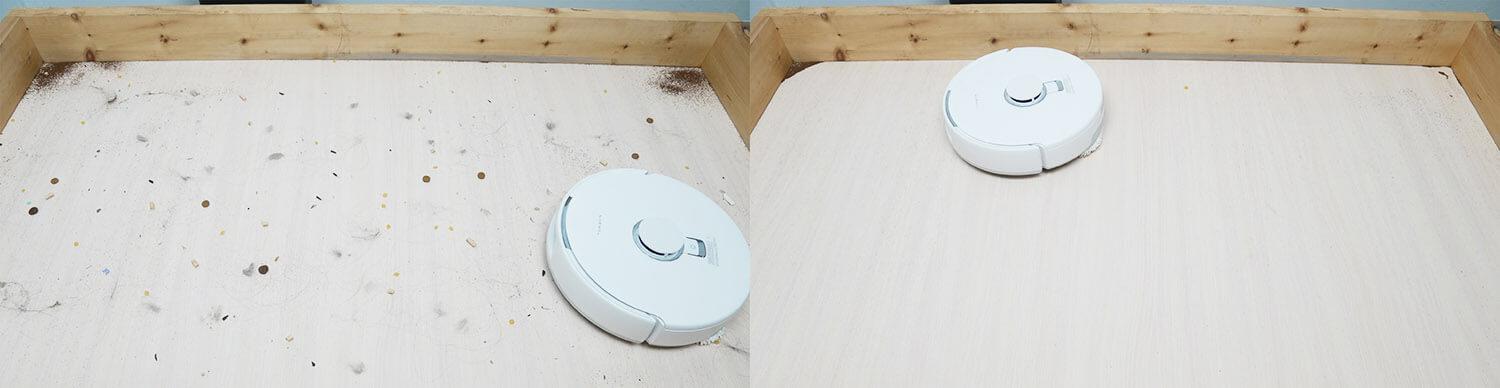 Šiukšlių surinkimo kokybė nuo laminuotų grindų buvo gera, įskaitant įvairias šiukšles nuo lentynos, įskaitant kačių kraiko granules, kurios dažnai užkemša turbo šepetį. Liko nešluoti tik kampai, nes robotas yra apvalus ir jo šoninis šepetys neišsikiša. Robotas taip pat nesugebėjo išvalyti išorinių kampų, o tai būtų gerai patobulinti.