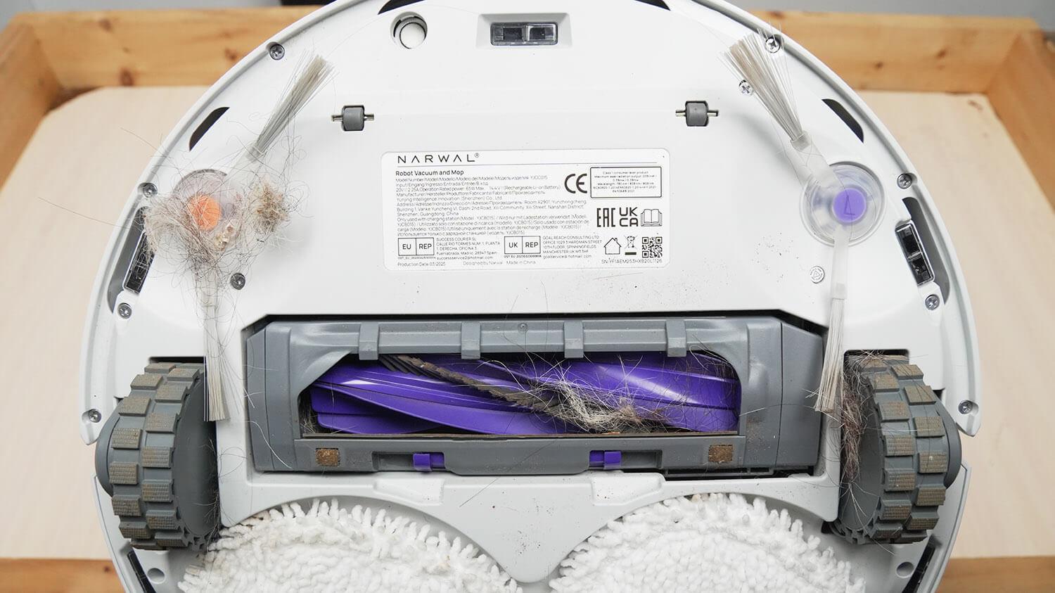 Centrinis šepetėlio blokas yra „plūduriuojantis“. Tai privalumas. Pats šepetėlis yra labai įdomaus dizaino. Tai įprastas šerelių ir silikoninių peiliukų derinys, tačiau „Narwal“ inžinieriai vieną kraštą suteikė nuožulniu kraštu. Tai vėlgi padeda išvengti plaukų ir kailio susipainiojimo aplink šepetėlį. Siurbimo kanalas buvo perkeltas į kraštą, kad plaukai ir kailis būtų išleidžiami tiesiai į dulkių surinktuvą.