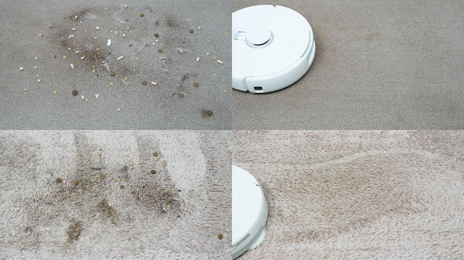 Be to, ant kilimų buvo išsibarstę šiukšlių. Galiu pasakyti, kad „Narwal Freo X Ultra“ kruopščiai išvalė tiek trumpo, tiek vidutinio plauko kilimus. Šio roboto cheminio valymo našumas yra puikus!