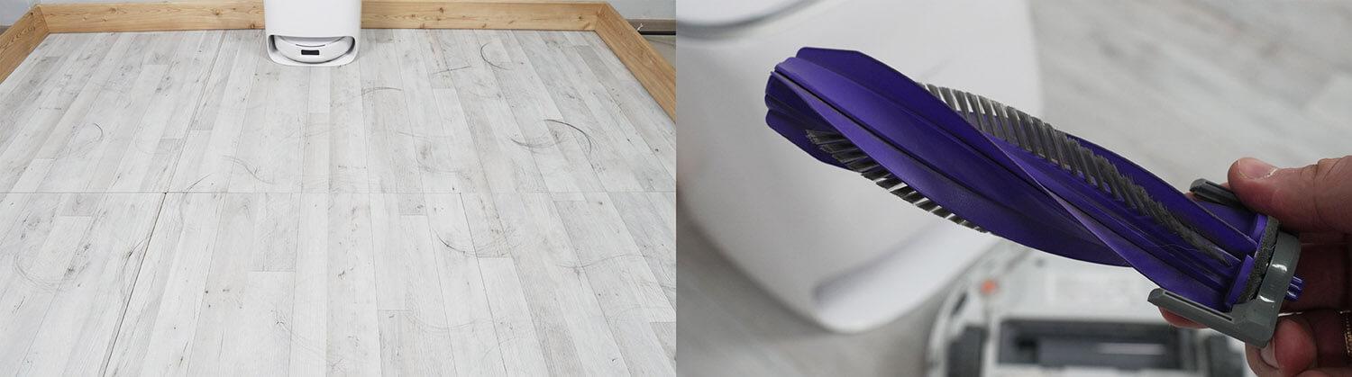 Taip pat išbandžiau, kaip patentuotas turbo šepečio dizainas neleidžia plaukams ir kailiui susivelti. Ant grindų patiesiau įvairaus ilgio plaukus. Robotas juos pakėlė ir pamatėme, kad šoninis šepetys buvo šiek tiek susivėlęs, bet centrinis šepetys buvo visiškai švarus!