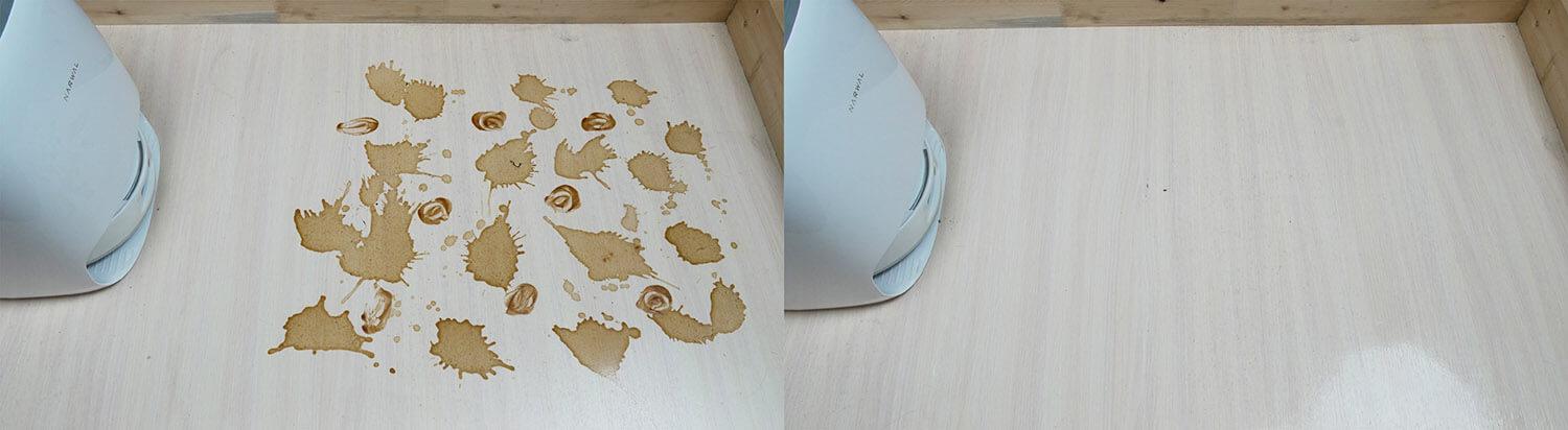 Kalbant apie sunkiai įveikiamas dėmes, robotas sugebėjo pašalinti net pridžiūvusias kavos ir padažo dėmes. Tiesa, ne iš pirmo karto. Tiksliau sakant, dauguma dėmių buvo pašalintos po šešto bandymo. Tačiau kelios mažos dėmės buvo visiškai pašalintos po septinto bandymo. Bet kokiu atveju, tai vienas geriausių rezultatų, o robotas demonstruoja aukštos kokybės šlapią valymą.