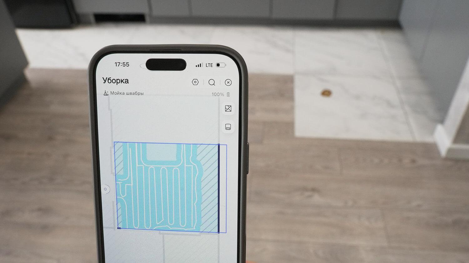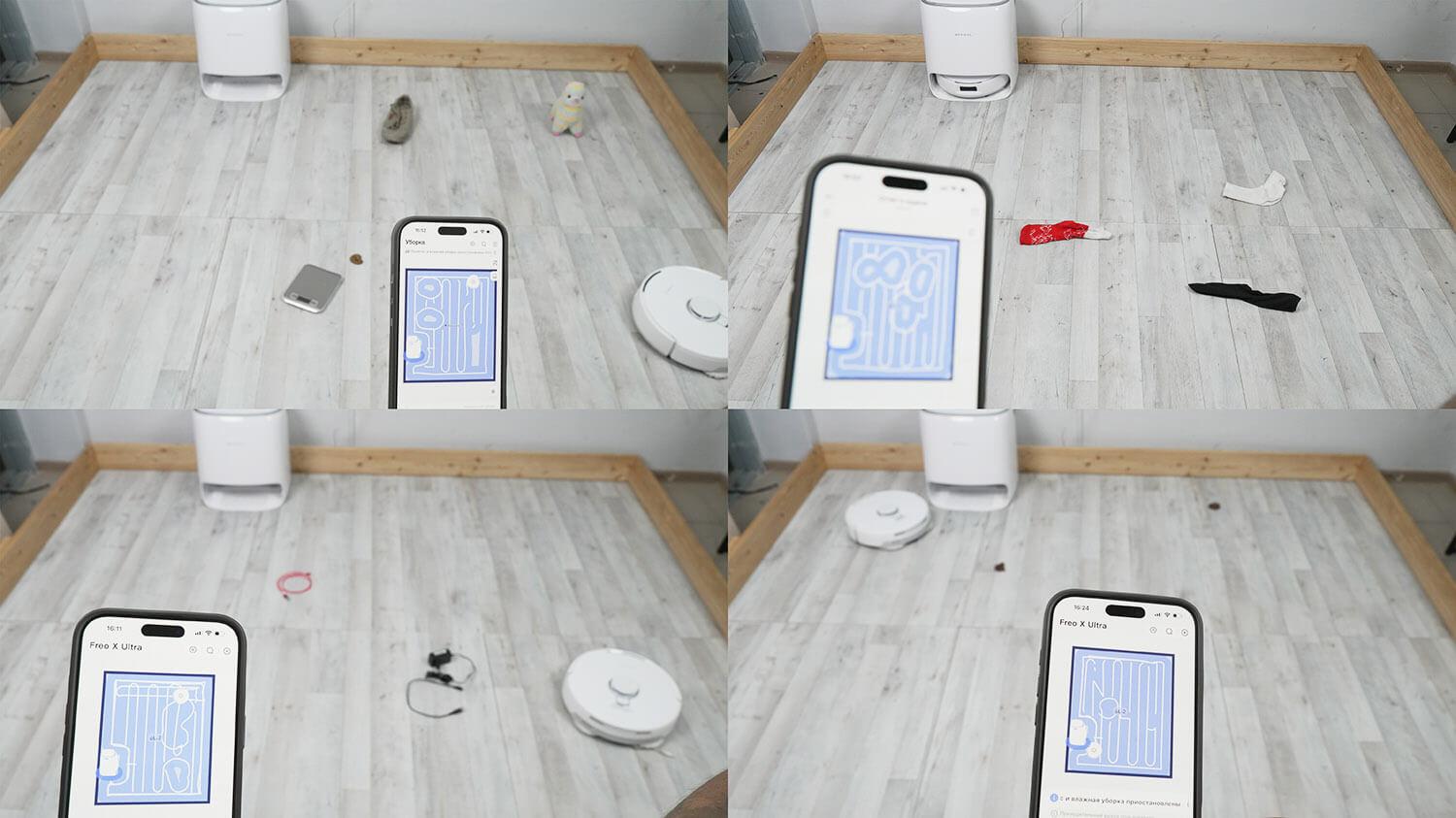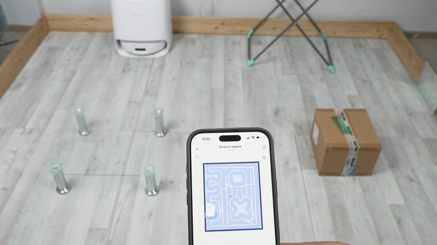 Galiausiai pereikime prie bandymų. Pirmiausia išbandysime „Narwal Freo X Ultra“ navigaciją kambaryje su kliūtimis. Pirmiausia robotas apeina kambario perimetrą, tada gyvatės būdu išvalo visą prieinamą plotą. Jis neužsikabino ant džiovyklės kojų, o tvarkingai jas apėjo. Jis taip pat apvalė dėžę ir stalo kojų išorę, o tada grįžo į savo pagrindą.