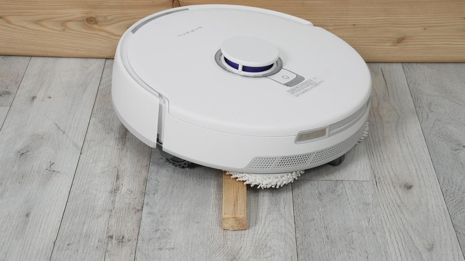 Taip pat išbandžiau baterijos veikimo laiką, kai robotas veikė maksimaliu galingumu ir įjungė šlapio valymo režimą. Jis veikė 103 minutes, išvalydamas 85 kvadratinius metrus naudingo ploto. Iš tikrųjų tai yra kiek daugiau nei du pilni dviejų miegamųjų buto valymai. Roboto baterijos veikimo laikas yra vidutinis.