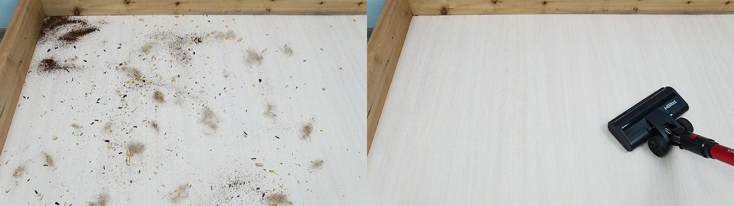 Dabar patikrinkime, kaip gerai dulkių siurblys surenka šiukšles nuo grindų. Ant laminuotų grindų išbarsčiau įvairių rūšių šiukšles: plaukus, kailį, grūdus, kačių kraiko granules ir kitas smulkias buitines šiukšles. Dulkių siurblys veikė puikiai, kampuose nebuvo jokių aklųjų zonų. Testas sėkmingas!