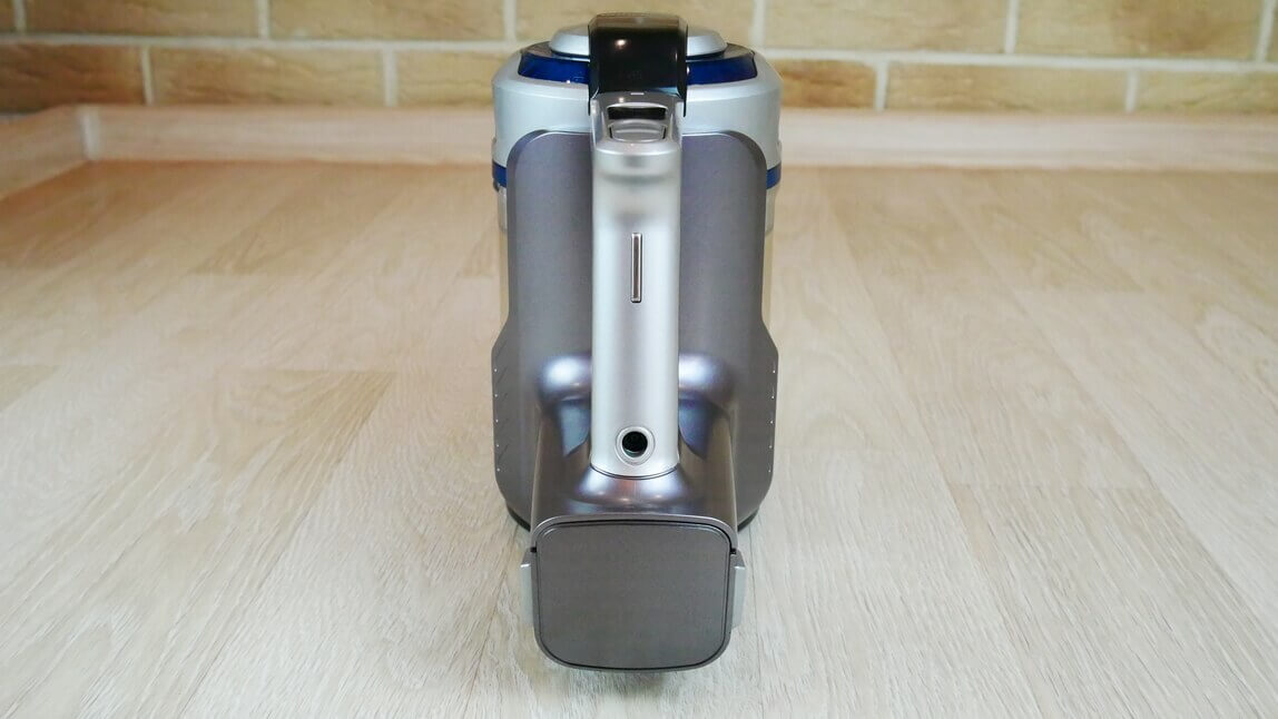 Siurbimas įjungiamas ir išjungiamas paspaudus rankenos mygtuką. Tai labai patogu, nes valymo metu nereikia laikyti mygtuko. Prireikus bateriją lengva išimti ir pakeisti.
