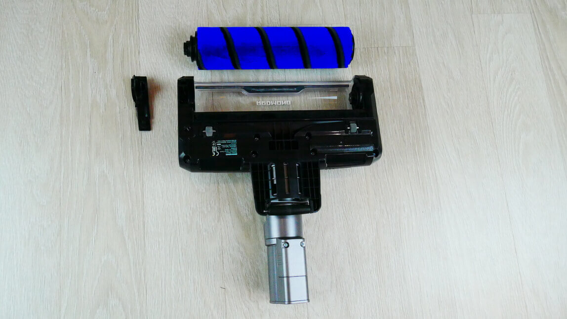 Pažvelkime į pagrindinį antgalį. Jis turi purų volelį, kuris geriau tinka kietoms grindims, tokioms kaip laminatas, parketas ir plytelės. Norėdami išardyti šepetį, naudokite plokščią atsuktuvą, kad pakeistumėte fiksavimo mechanizmo padėtį. Pats volelis yra aukštos kokybės, su tankiais šereliais.