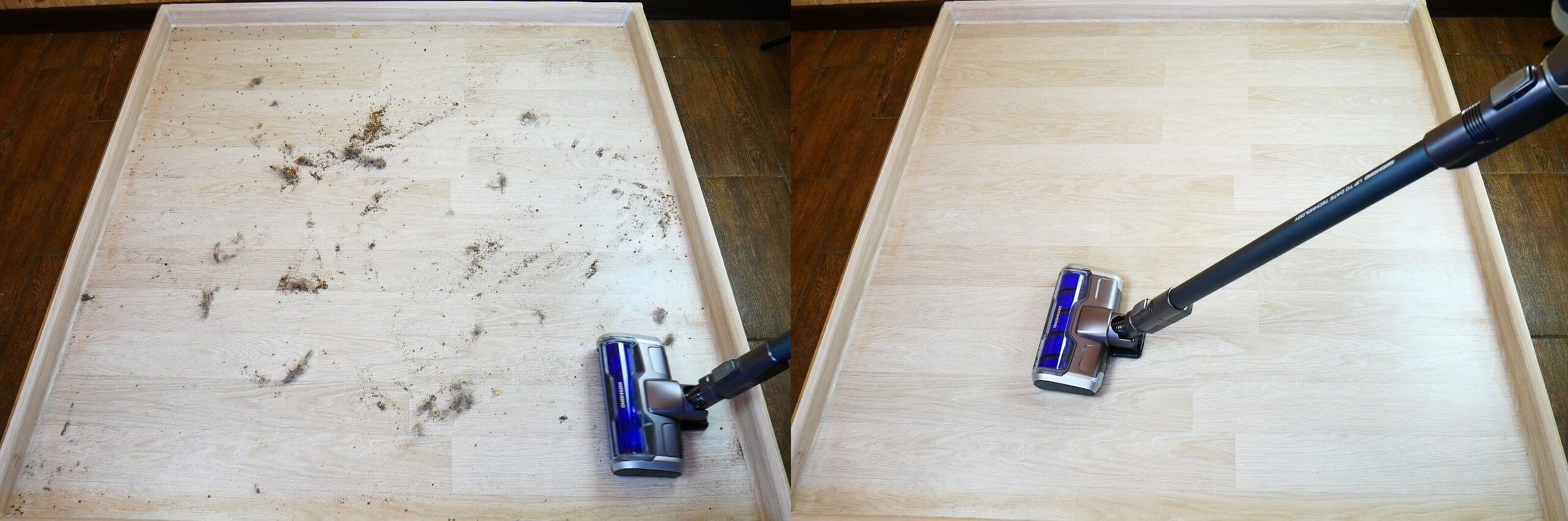 Dulkių siurblys pašalino visas šiukšles nuo grindų, taip pat gerai jas surinko kampuose ir palei grindjuostes. Volas nesurinko jokių šiukšlių. Visos šiukšlės buvo surinktos į konteinerį.