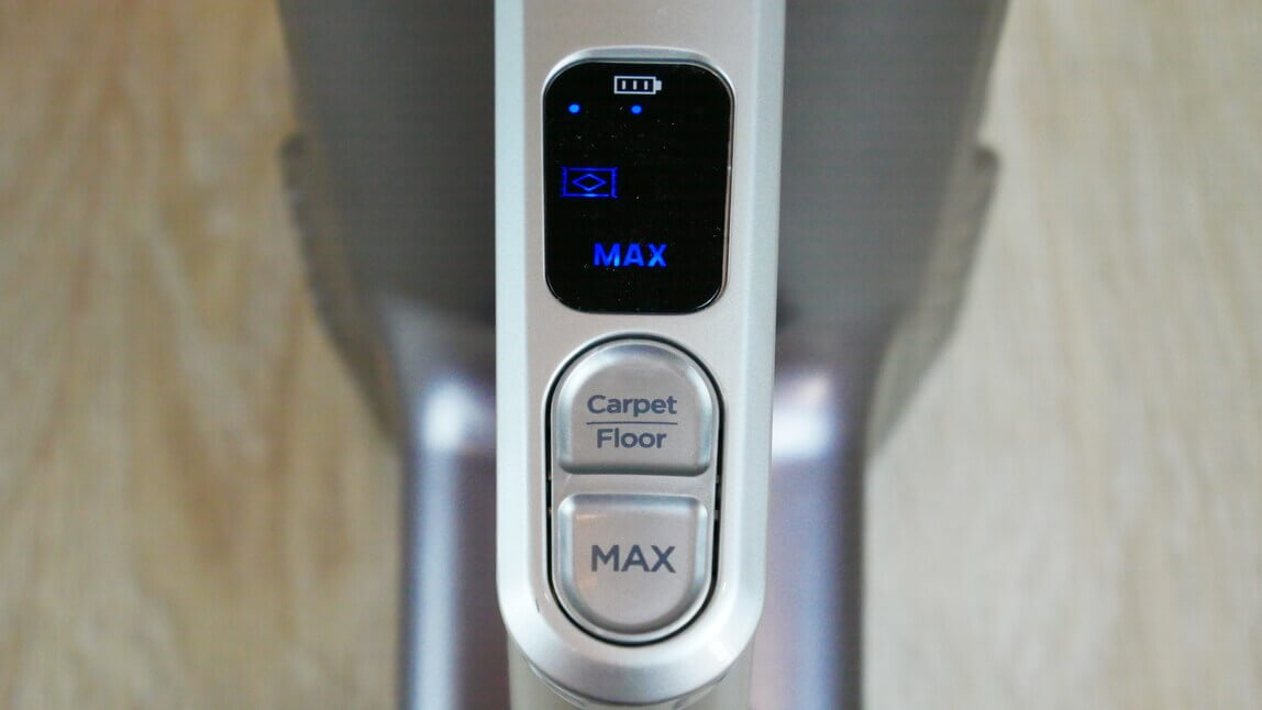 Pažvelkime į pagrindinį įrenginį. Ekranas iš karto patraukia akį, rodydamas pagrindinę valymo informaciją. Tai apima akumuliatoriaus įkrovos būseną ir pasirinktą valymo režimą. Šis rankinis dulkių siurblys turi du režimus: kilimų ir kietų grindų. Skirtumas tarp jų yra pagrindinio antgalio volelio sukimosi greitis. Kilimų režimu volelis sukasi greičiau. Taip pat yra mygtukas, skirtas maksimalios galios režimui, todėl iš viso galite rinktis iš dviejų režimų: maksimalaus ir standartinio.