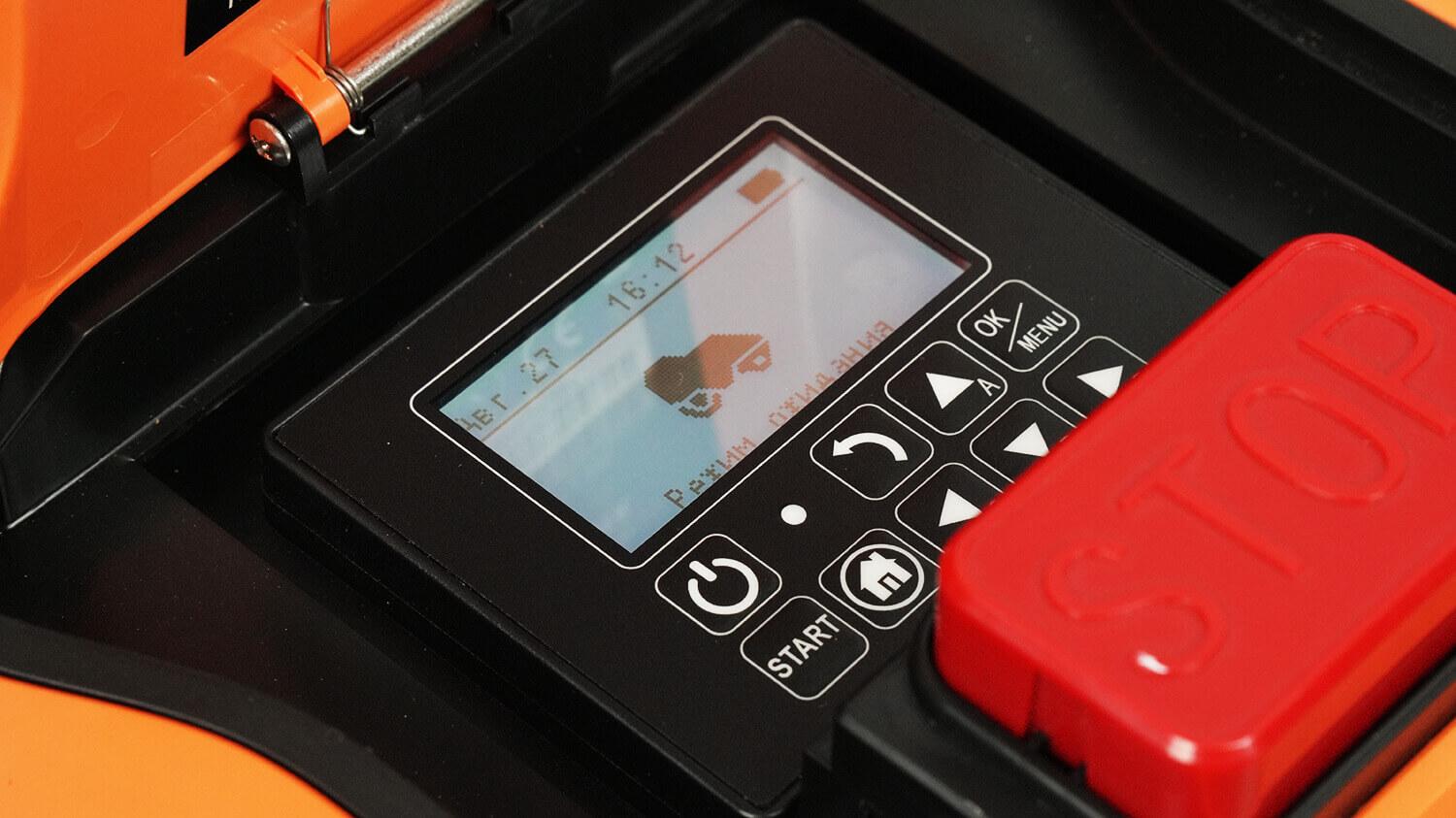- Informacinis ekranas ant korpuso, per kurį taip pat galite valdyti robotą ir reguliuoti pjovimo parametrus.