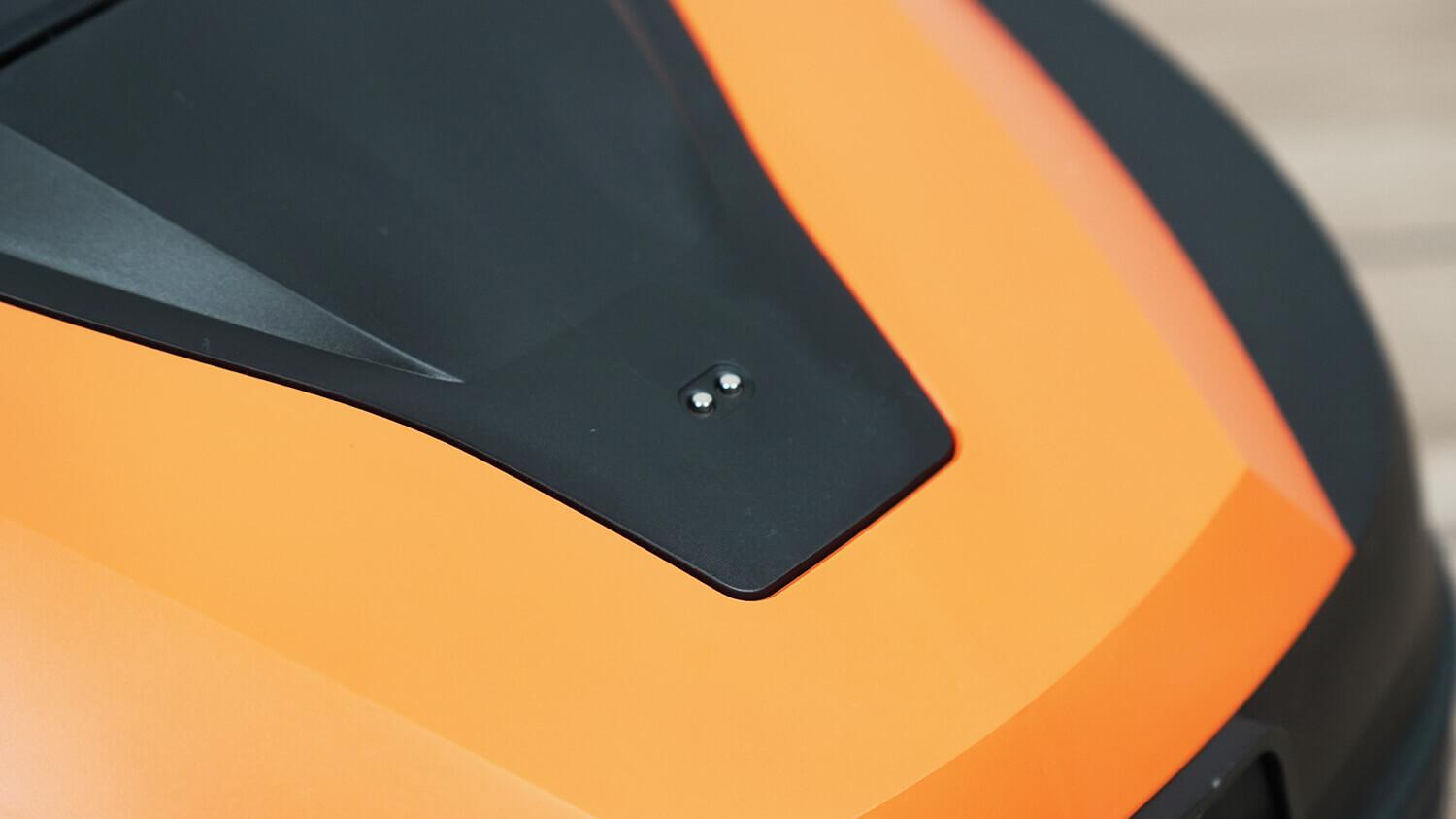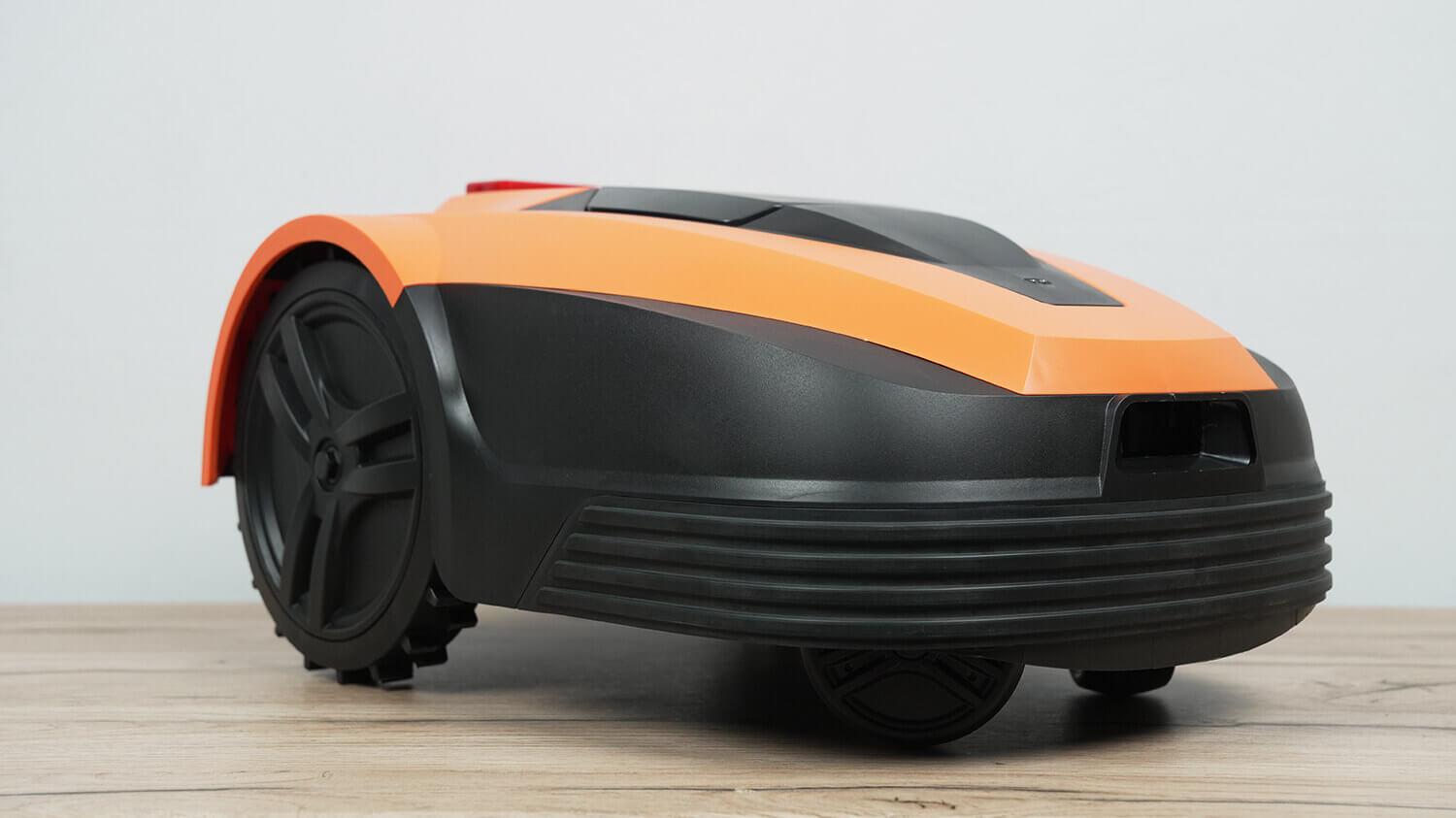 Dabar pažvelkime į „Robokos RM600i“. Tai robotinė vejapjovė su pažįstamu dizainu, oranžine ir juoda spalvomis.
