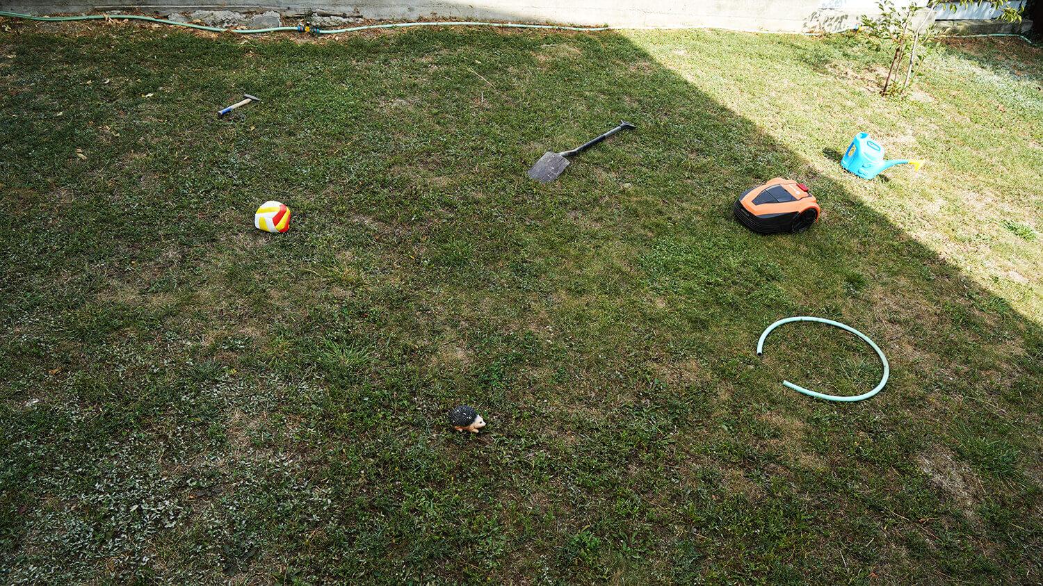 Taip pat išbandžiau aktyvųjį buferį. Aplink veją išdėliojau įprastus daiktus, kurie gali atsirasti arba būti netyčia palikti. Robotas pervažiavo žarną, kastuvą, plaktuką ir kamuoliuką, trumpam užstrigo ant kastuvo ir parvertė laistytuvą bei ežį.