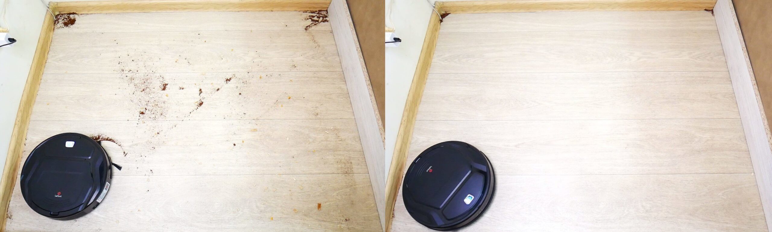 Laminuotų grindų cheminio valymo našumas buvo vidutinis. „Lefant M201“ nešlavė kampų taip gerai, kaip dauguma kitų apvalių robotų, tačiau surinko didžiąją dalį šiukšlių. Tik nedidelis kiekis šiukšlių liko ant grindjuosčių.