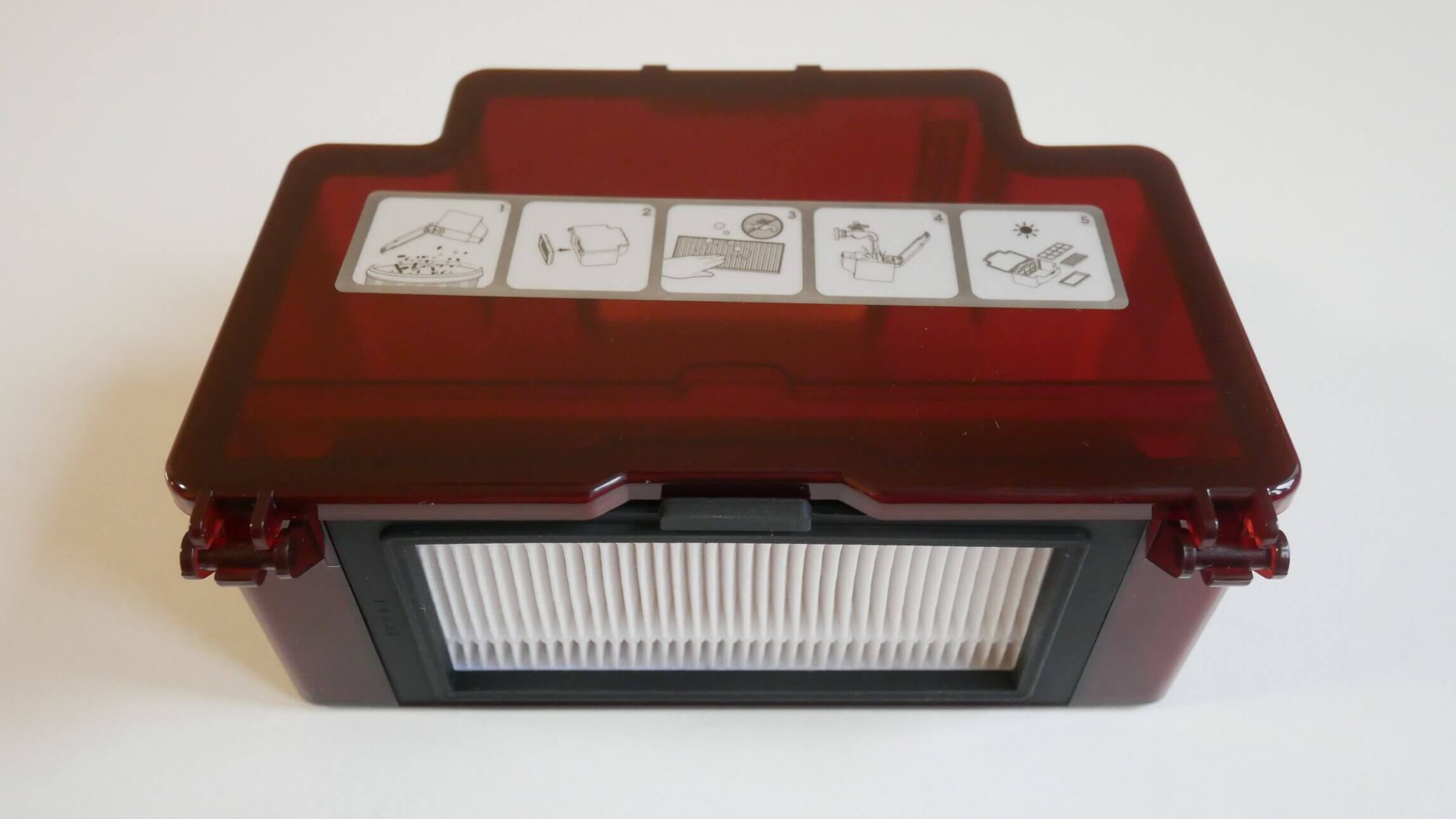 Dulkių surinkimo konteineris yra gana erdvus, jo talpa yra 500 ml. Jame yra tinklelio filtras ir HEPA filtras. Apsauginė sklendė taip pat neleidžia šiukšlėms netyčia iškristi išimant konteinerį. Lipduke ant konteinerio viršaus yra gamintojo rekomendacijos, kaip tinkamai naudoti konteinerį ir filtrus. HEPA filtro neskalaukite vandeniu.