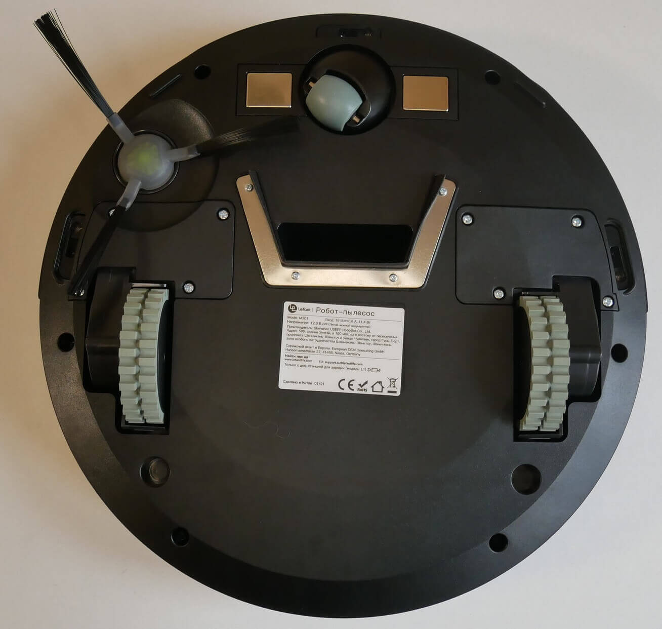 Žemiau matome vieną greito atleidimo šoninį šepetėlį, įkrovimo gnybtus, pasukamą volelį ir centrinę siurbimo angą. Taip pat svarbu atkreipti dėmesį, kad korpuso apačioje yra sumontuoti trys apsaugos nuo kritimo jutikliai, kurie veikia tinkamai.