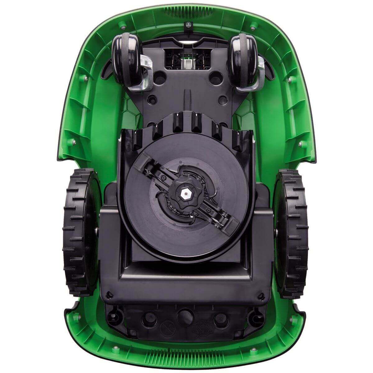 Priekinėje dalyje yra įkrovimo kontaktas, skirtas prijungti prie bazinės stoties, o galinėje dalyje yra patogi ergonomiška rankena, kuri gali būti naudinga transportuojant vejapjovę iš vienos pjovimo zonos į kitą, jei turite kelias.