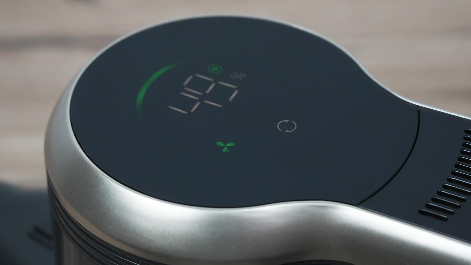 Dulkių siurblys įjungiamas ir išjungiamas paspaudus mygtuką, esantį po nykščiu. Viršuje yra informatyvus ekranas su lietimui jautriu maitinimo režimo jungikliu. Yra trys maitinimo režimai: žemas, vidutinis ir aukštas.