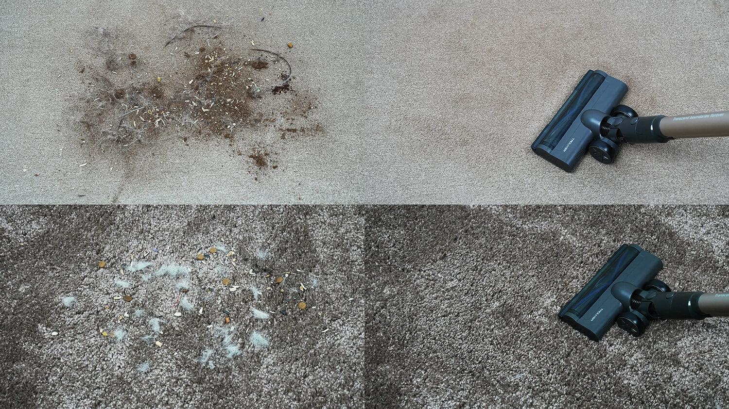 Kalbant apie dulkių surinkimą nuo kilimų, dulkių siurblys puikiai valo tiek trumpo, tiek vidutinio plauko kilimus. Išlaikė testą!