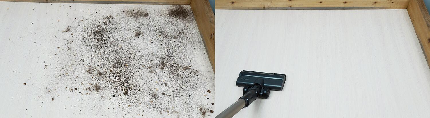 Dabar patikrinkime, kaip gerai „Trouver J40“ surenka grindų šiukšles. Ant laminuotų grindų išbarsčiau įvairių rūšių šiukšles: plaukus, kailį, grūdus ir kitas smulkias buitines šiukšles. Ši mašina atliko gerą darbą. Kampuose nėra aklųjų zonų, o tai yra privalumas.