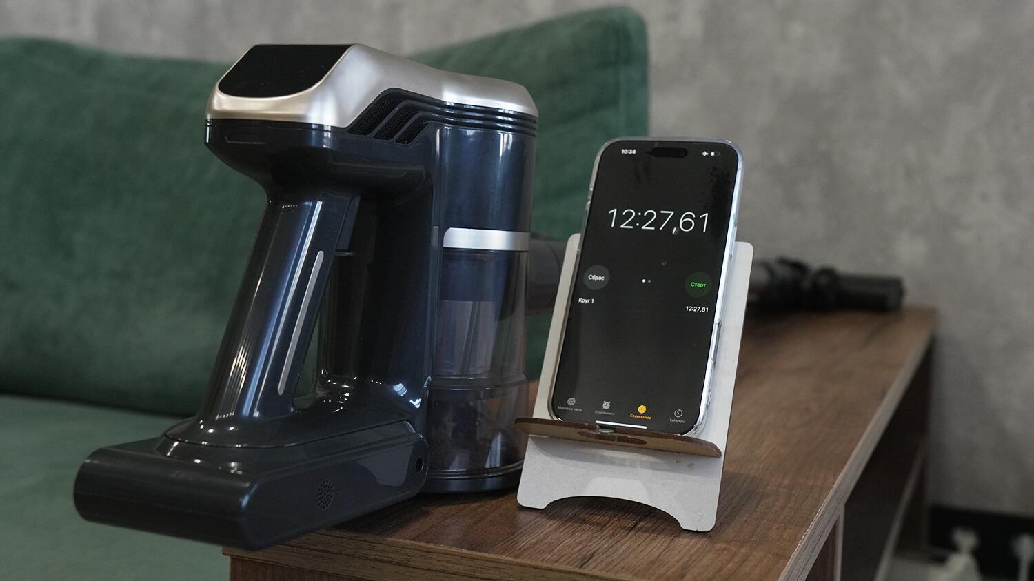 Galiausiai pereikime prie bandymų. Pirmiausia patikrinkime „Trouver J40“ baterijos veikimo laiką esant maksimaliai galiai ir prijungtam pagrindiniam grindų antgaliui. Jis veikė 12 minučių ir 27 sekundes – tai tipiškas rezultatas.